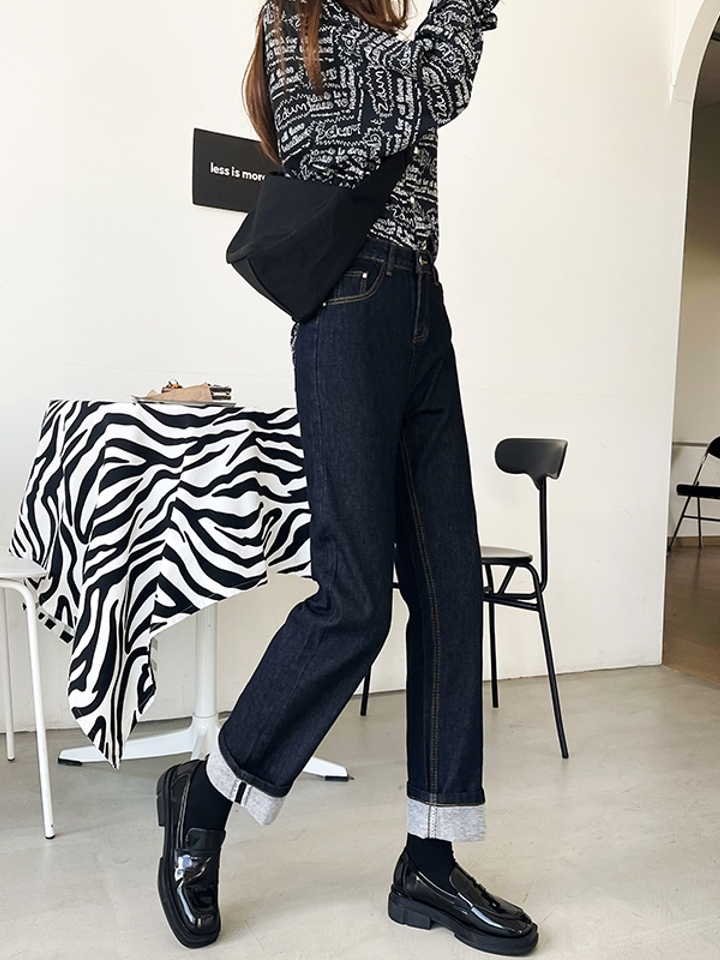 九分卷边的处理,俏皮可爱,显露纤细的脚踝。通过流畅的线条裁剪出一气呵成的直筒版型,不贴合腿部,巧妙修饰出笔直的腿型。固定的卷边裤脚造型,形成九分裤长,与潮流接轨,更添时尚感。