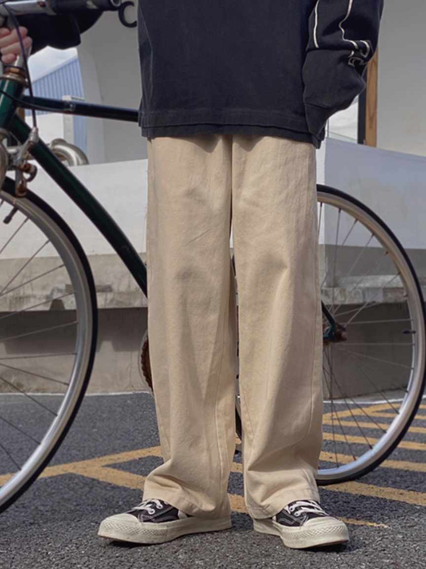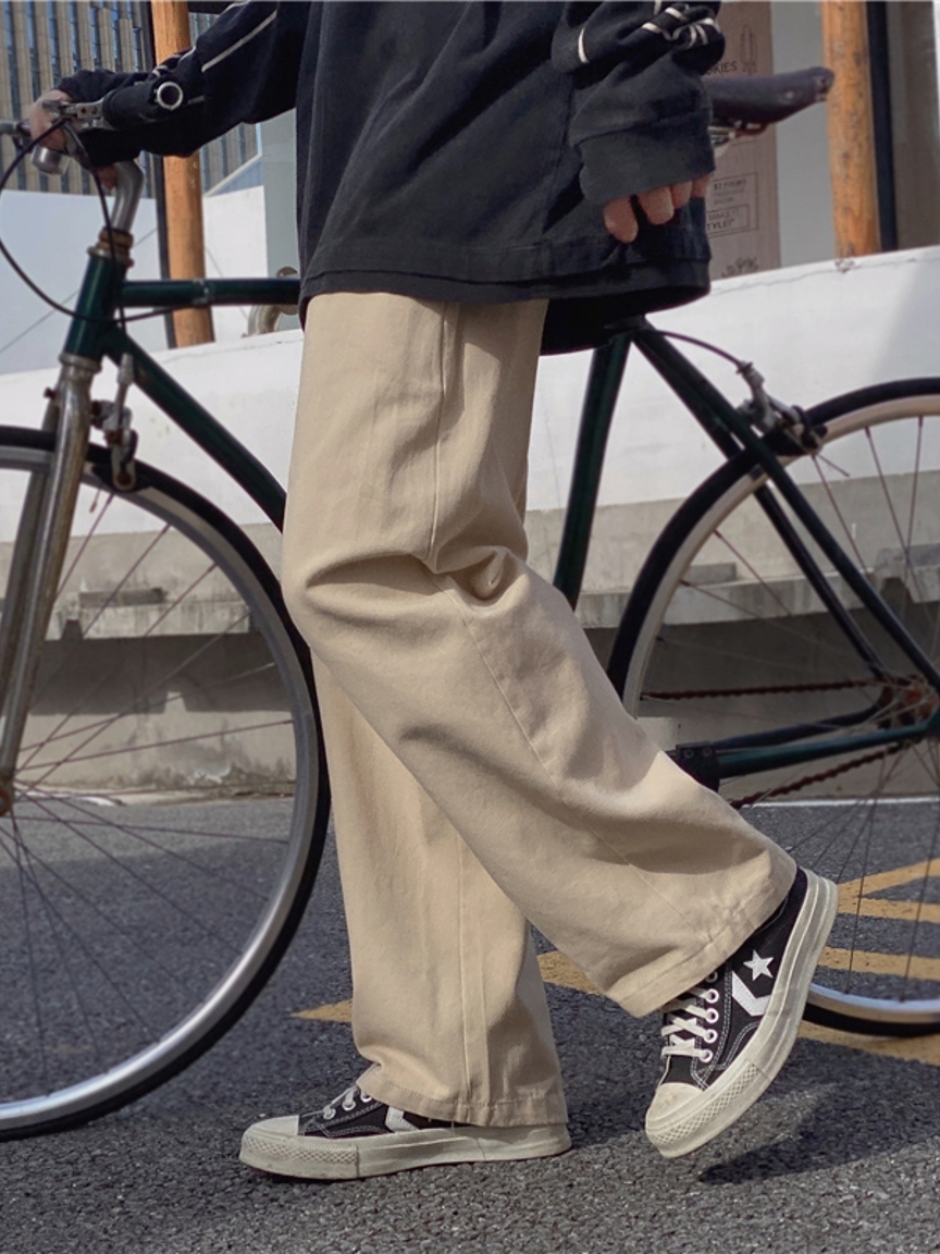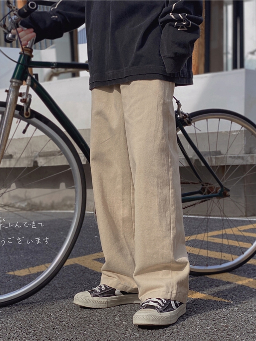 一款日系风格的卡其色直筒休闲裤,直筒的裤型设计,搭配上拖地的款式,轻松打造出大长腿的即视感。