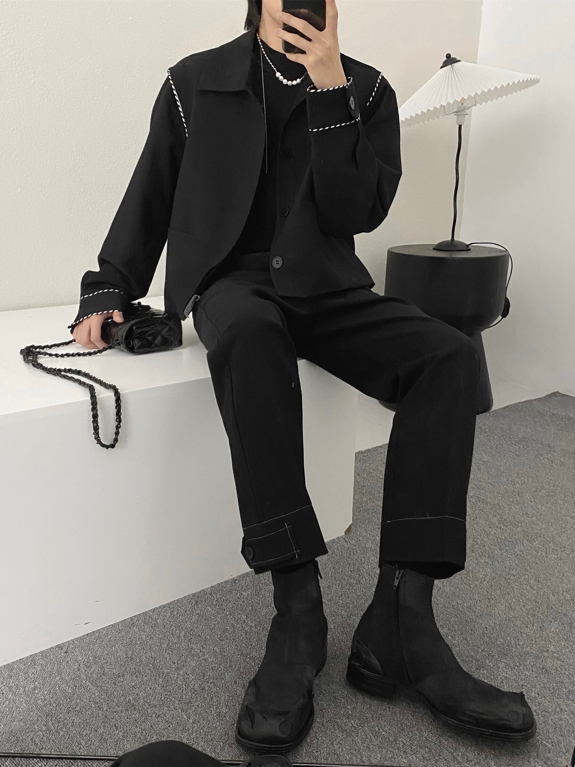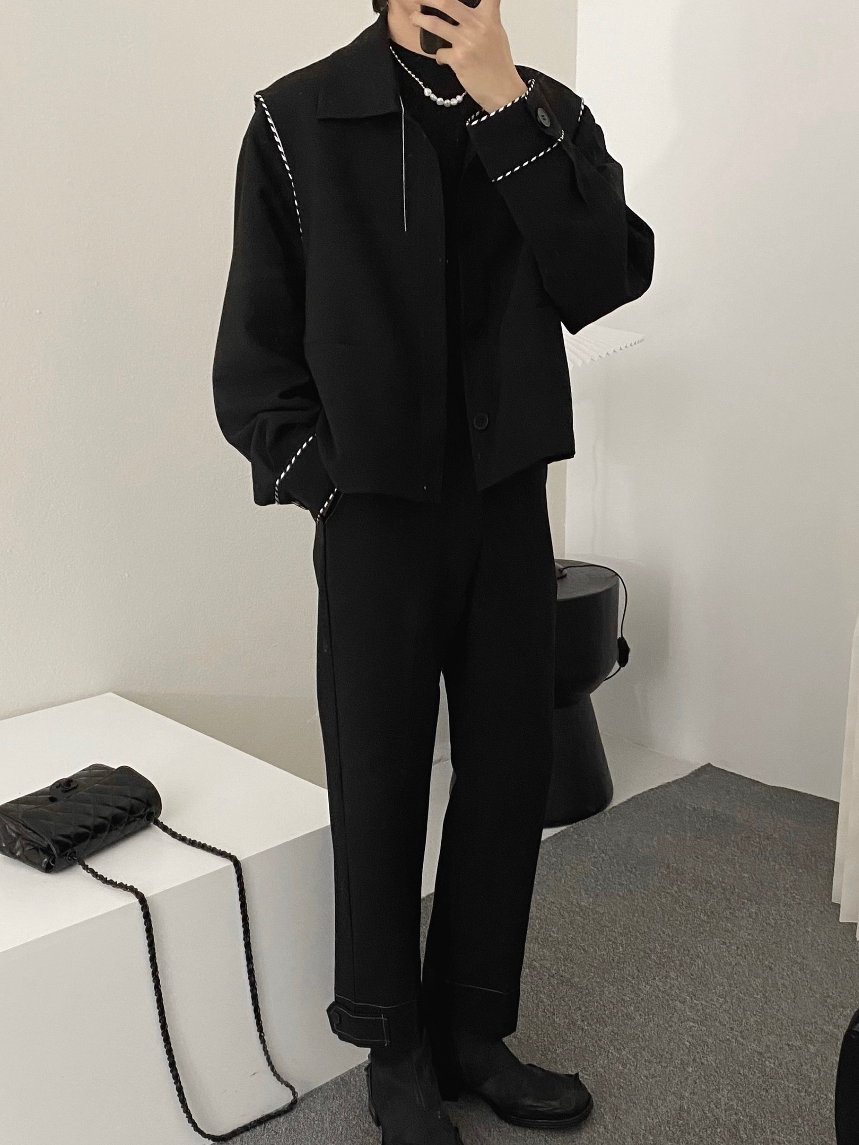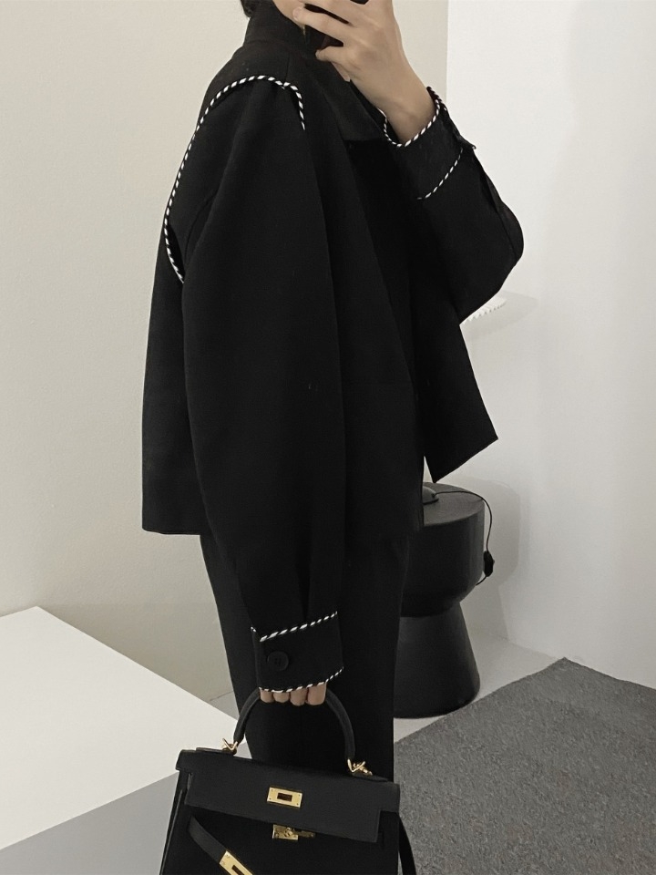 衣身做了撞色的拼边设计,具有很强的吸引力还能丰富衣身的层次效果,让黑色的衣身不显单调感。