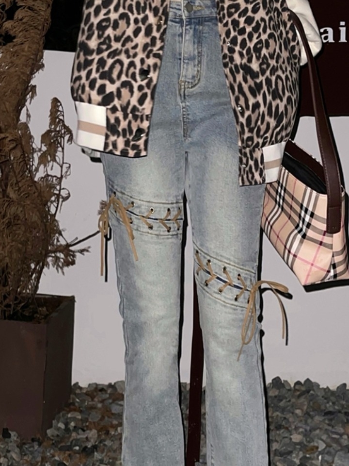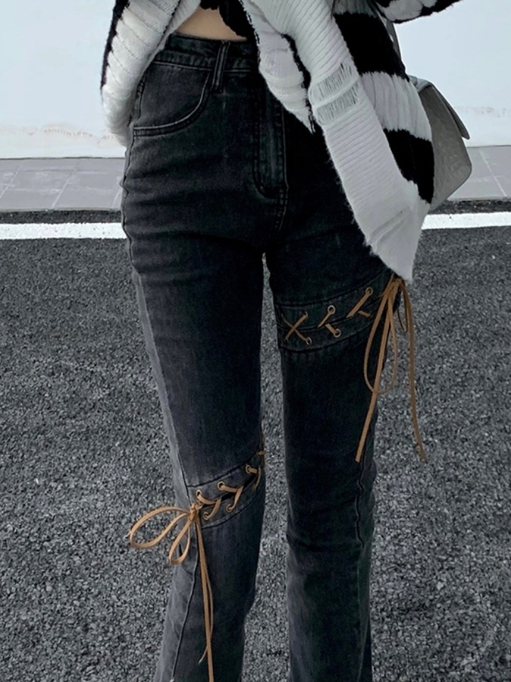 时髦的高腰牛仔裤,舒适又修身,宽松的直筒裤版型,百搭不挑身材, 侧边的开叉处理和绑带连接处理显得个性十足,张扬着不羁的街头风范,开叉的裤脚行走间随意翻飞,时尚又吸睛的款。