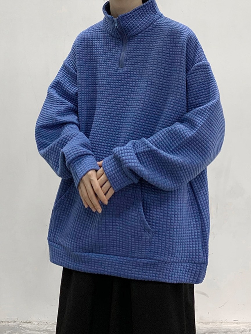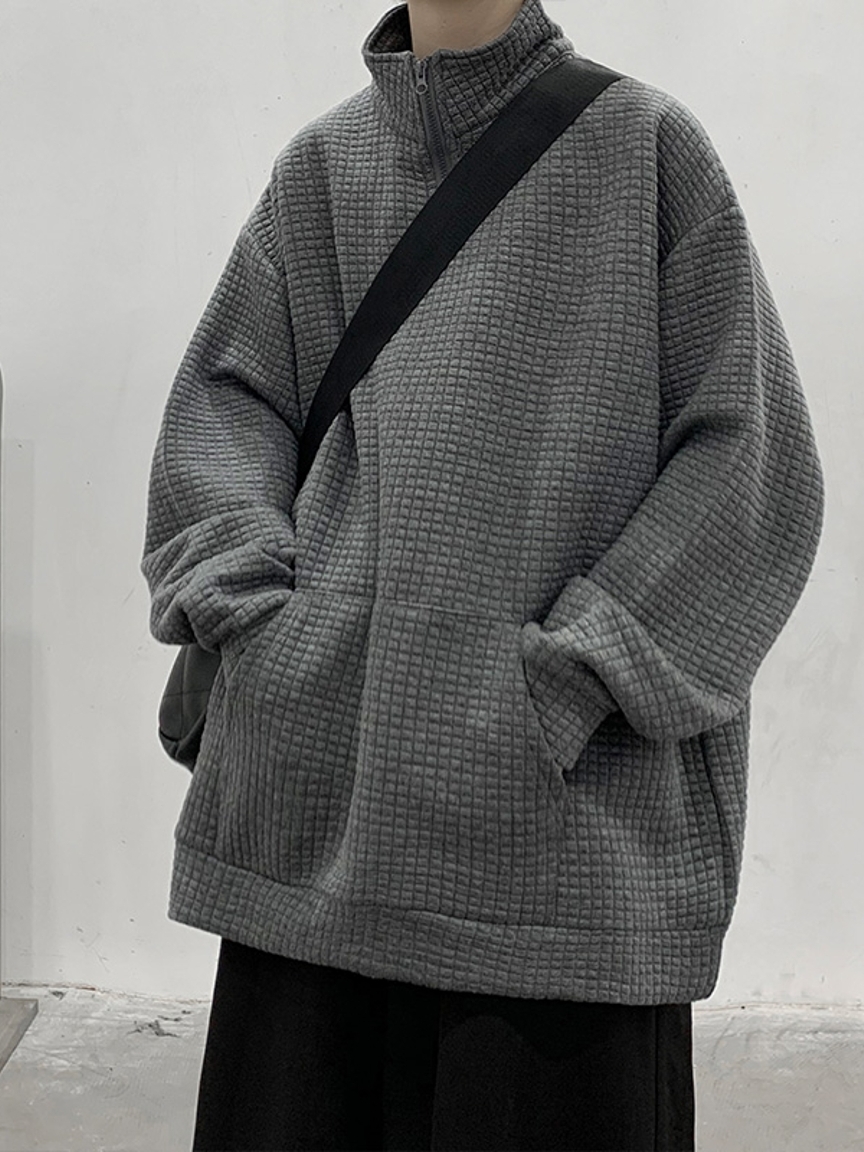 衣服是大方的立领,可以起到防风作用,半拉链的设计,使穿脱更加方便,衣身版型超宽松,完全不挑身材。