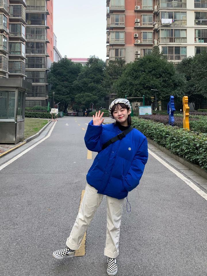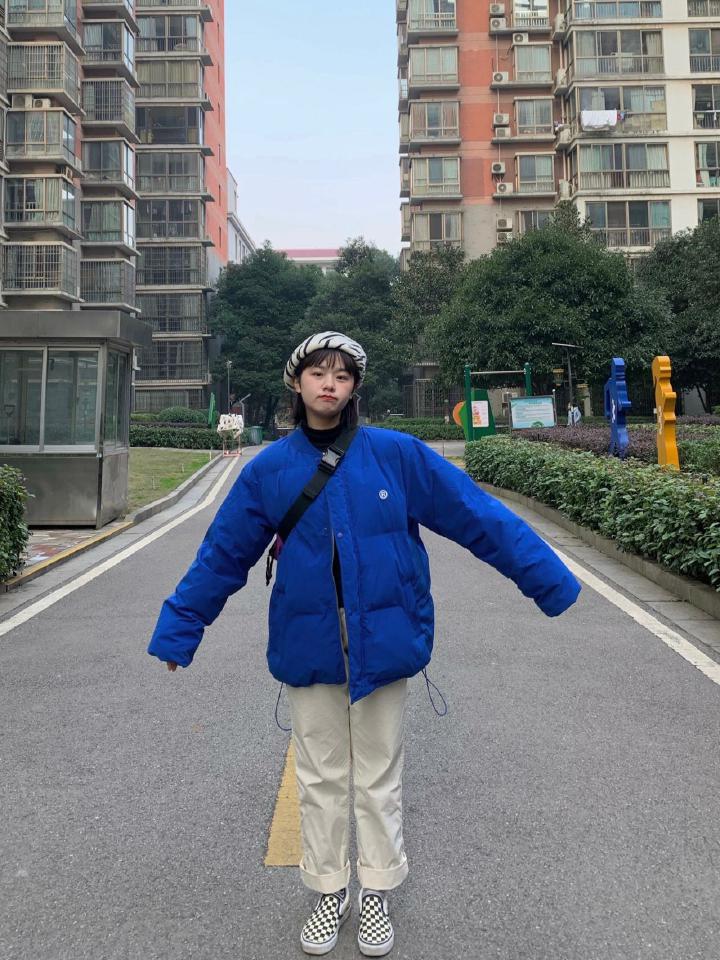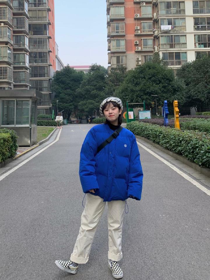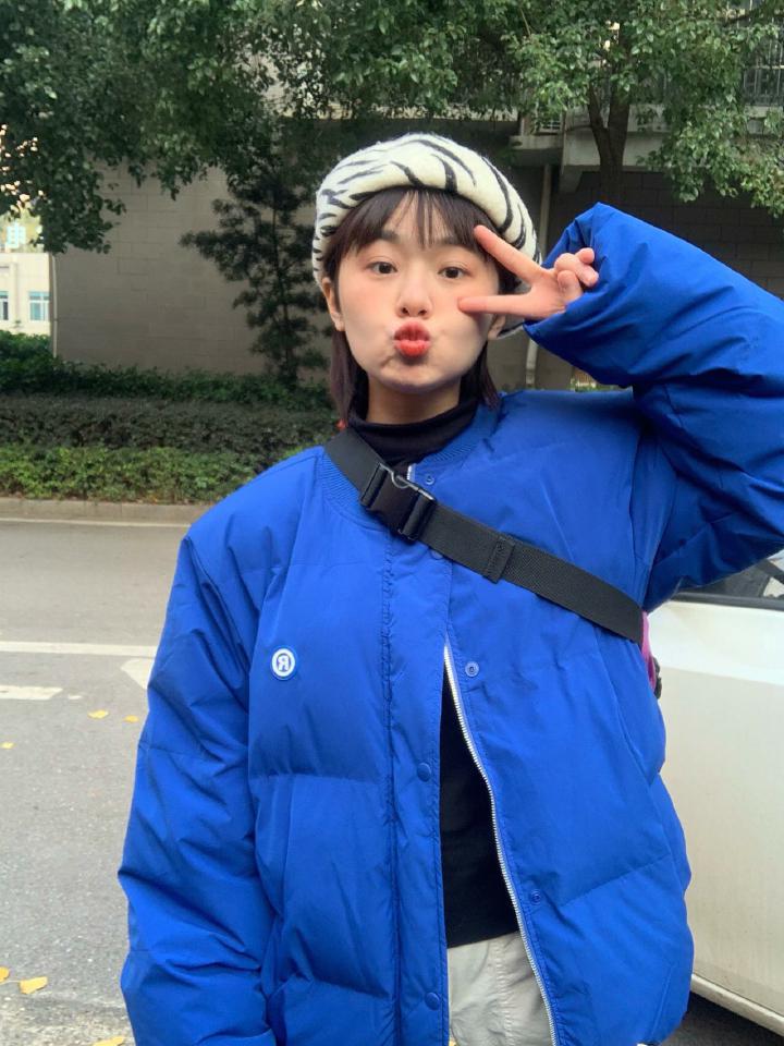 蓝色也非常显皮肤白,非常小清新,上身效果不会太蓬,颜色超级正,特别奶就是有点不耐脏,薄薄又很保暖,面料很舒服,手感细腻,轻盈!加的是3M羽绒棉。内里如果有内袋就更好更高级了。