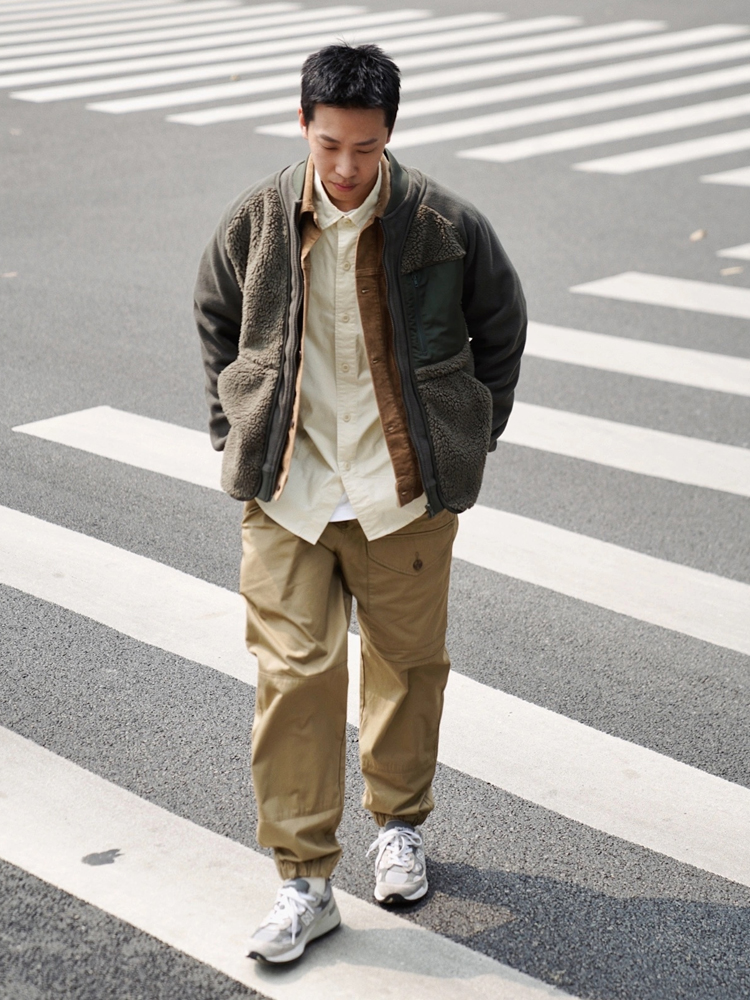 这件简约复古风的摇粒绒长袖外套,不妨内搭一件白色打底衫,延续这一份沉着大方感。下半身着驼色休闲裤,将多余的小肉肉隐藏起来吧。