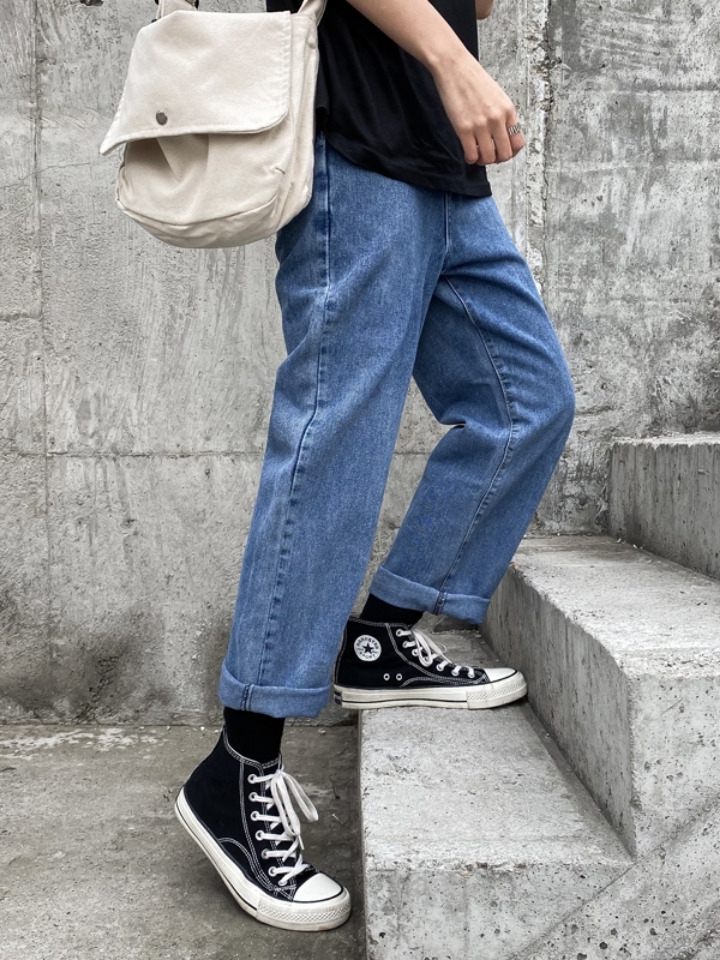 直筒阔腿宽脚设计,裤脚个性的上翻设计,增添了裤款的层次感。中腰直筒版型,对身材包容性强,尤显百搭易穿。腰间系上一根个性腰带,成为点睛之笔