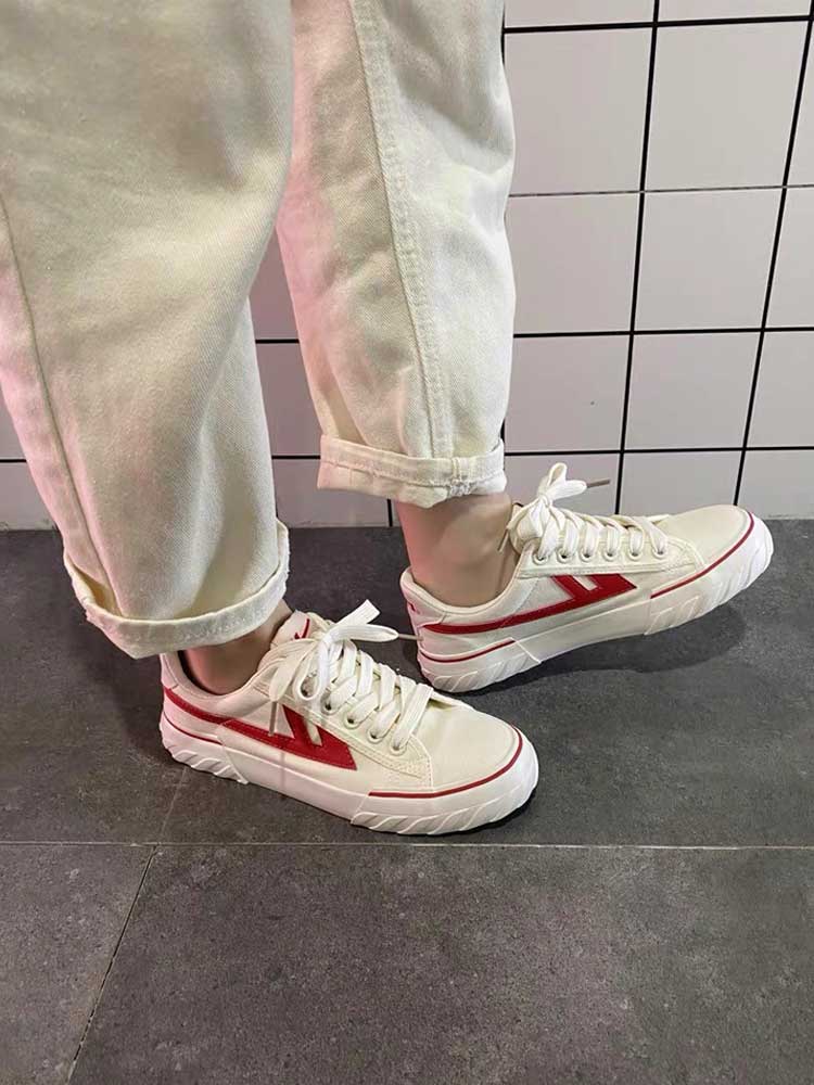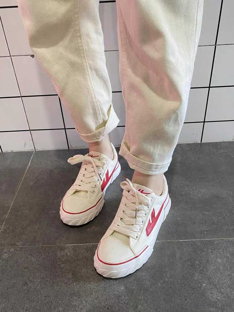 回力低帮纯色帆布鞋,流露干净、利落的风格。整个是白色的,红色logo和一圈红色的边框,挺别致的,无论是日常穿搭还是运动都是不错的选择。