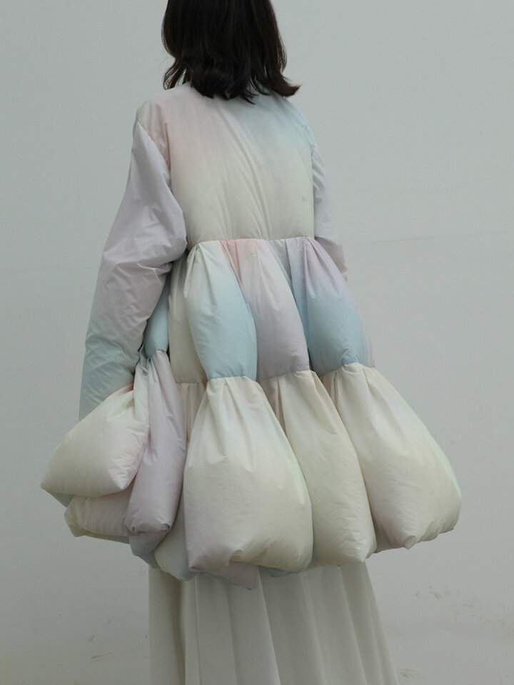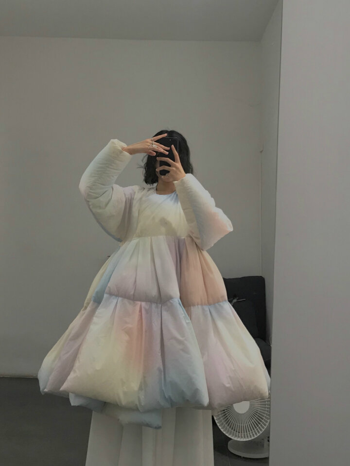 这款彩色花苞蛋糕裙圆领羽绒服,高充绒的白鸭绒,蓬松柔软,非常饱满,穿着防风舒适。宽松的版型,花苞口袋设计,下摆开叉细节,形成时髦的廓形效果,很洋气。