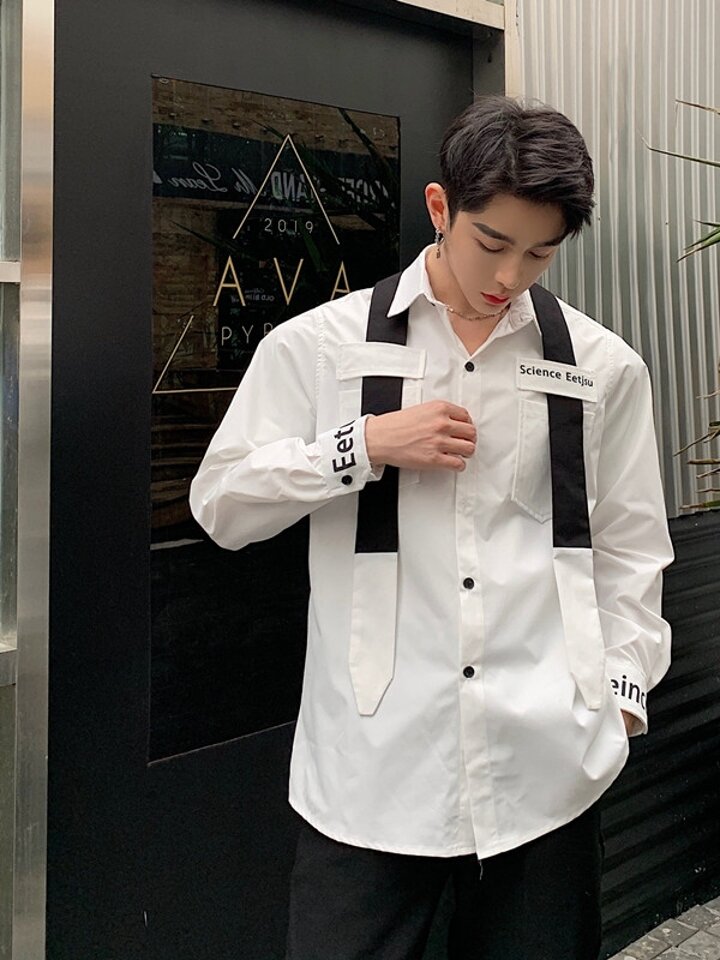 干净爽朗的白色衬衫,中性风的宽松廓形,透着一丝爽朗的气息,随性慵懒,挺阔的肩部时机,饰以压线的点缀,凸显出流畅利落的气息,两边不规则的口袋设计,结合不规则的前短后长的下摆剪裁,随性自由凸显个性与帅气感,而后背采用灵动的字母印花点缀,打破单调,带有视觉冲击。以极具跳跃感与艺术性的黑色字母印花图案,点缀素雅清新的白色基调,搭配挺括工整的衬衫款式,彰显男士文雅气场;精巧细致的翻领做工,增加男士干练气质。