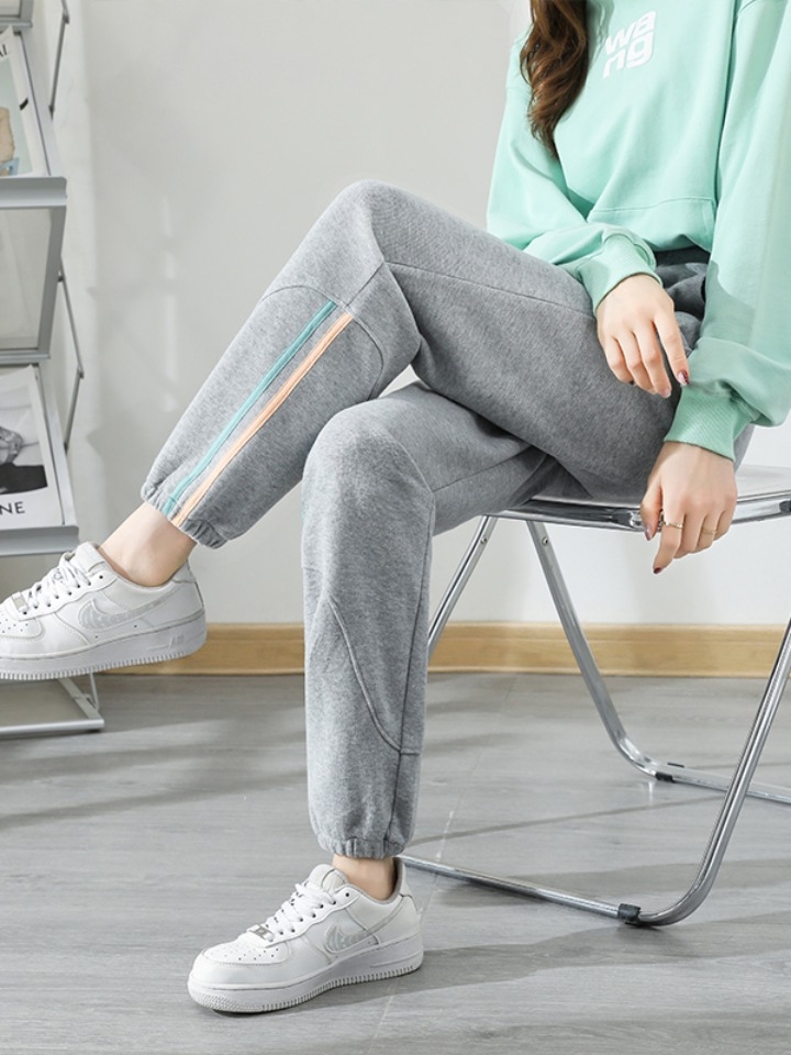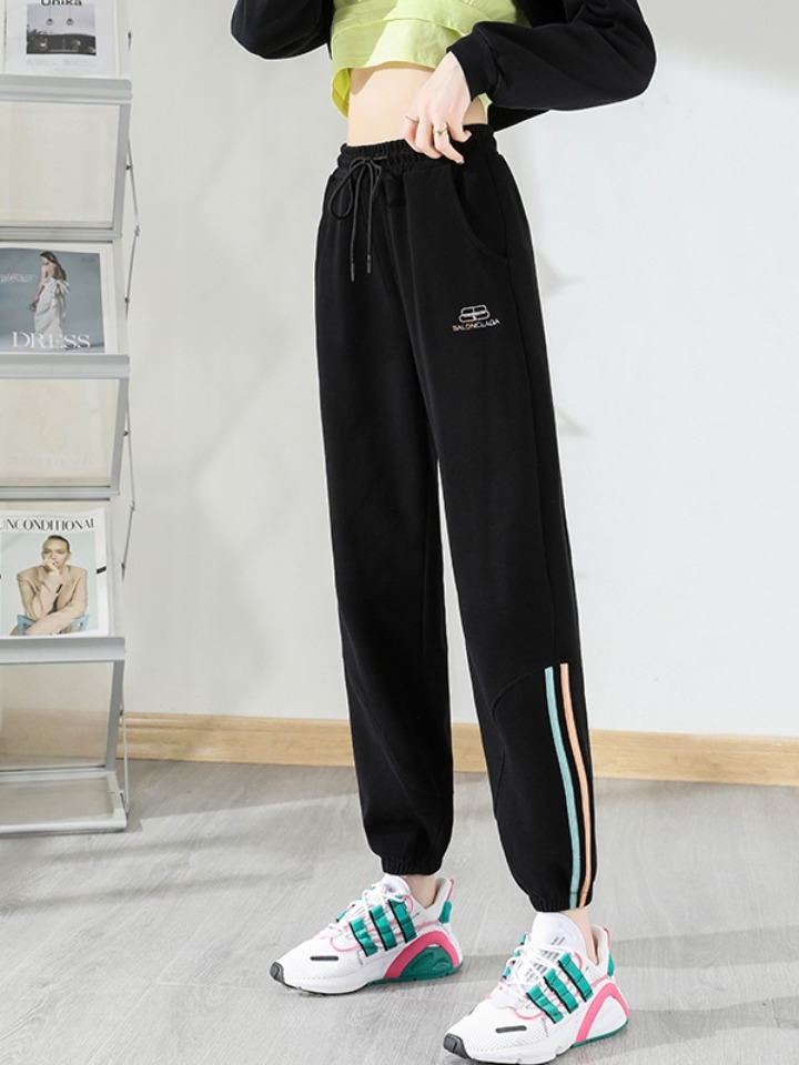 运动的时候为了更好的保护腿,可以选择这样长款的运动裤,浅浅的灰色看着增添裤子的亲和力,这款休闲裤以黑色打底,酷炫有型,裤脚处的红色英文字母精致细腻增添亮点。