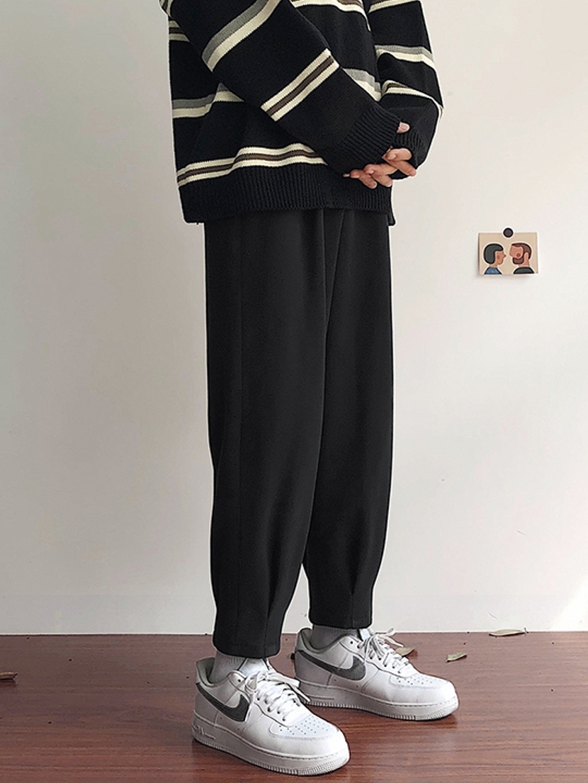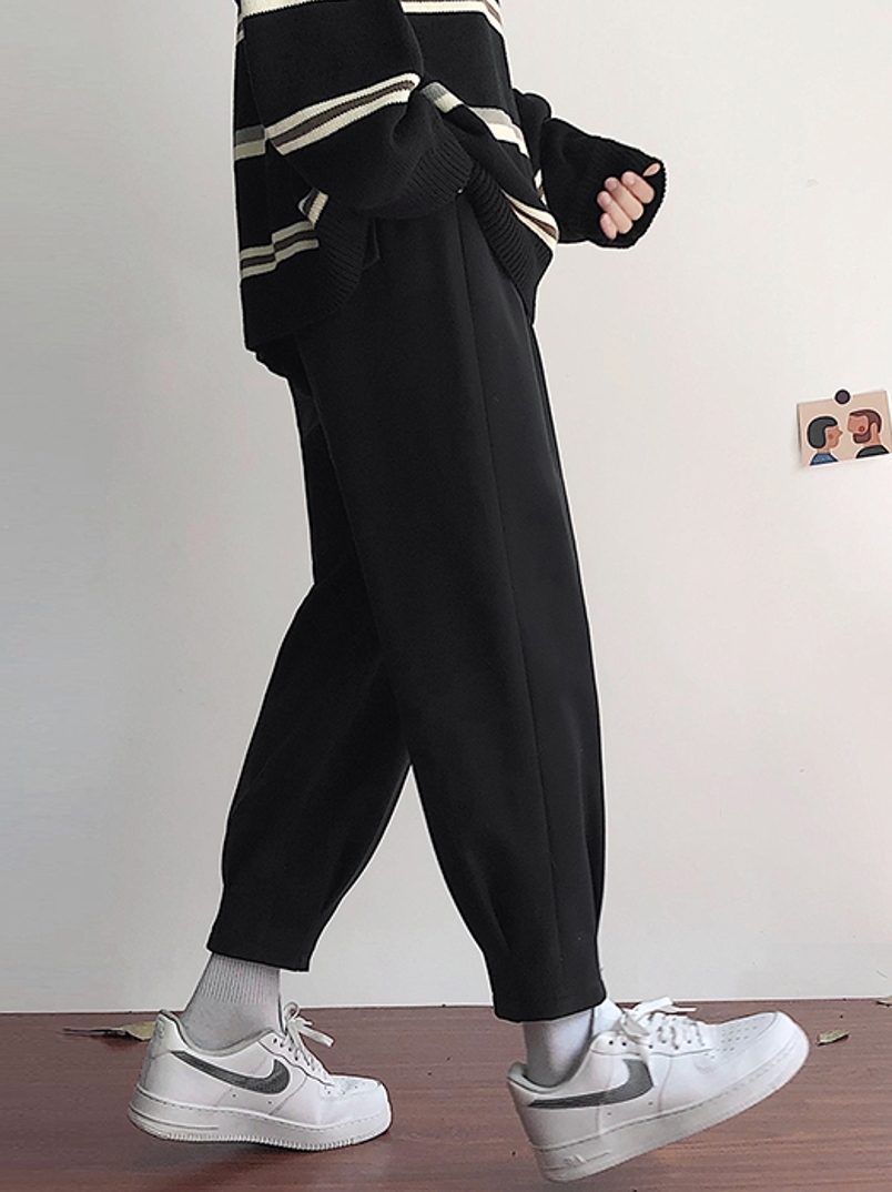 一款原宿风的纯色毛呢西裤,宽松的裤腿设计,很好的修饰了腿型,裤脚处的收口设计,上身显瘦又显高挑。