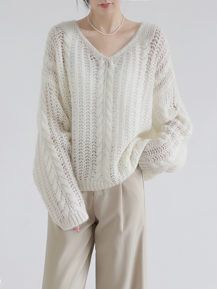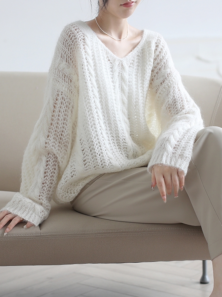 螺纹的v字领口,简洁的衣身上镂空的钩花设计,结合柔情似水的马海毛面料,以巧妙的方式展现出不一样的性感味道,宽松的版型上身就像是从男朋友衣柜里找出来的一样,慵懒却超有范!