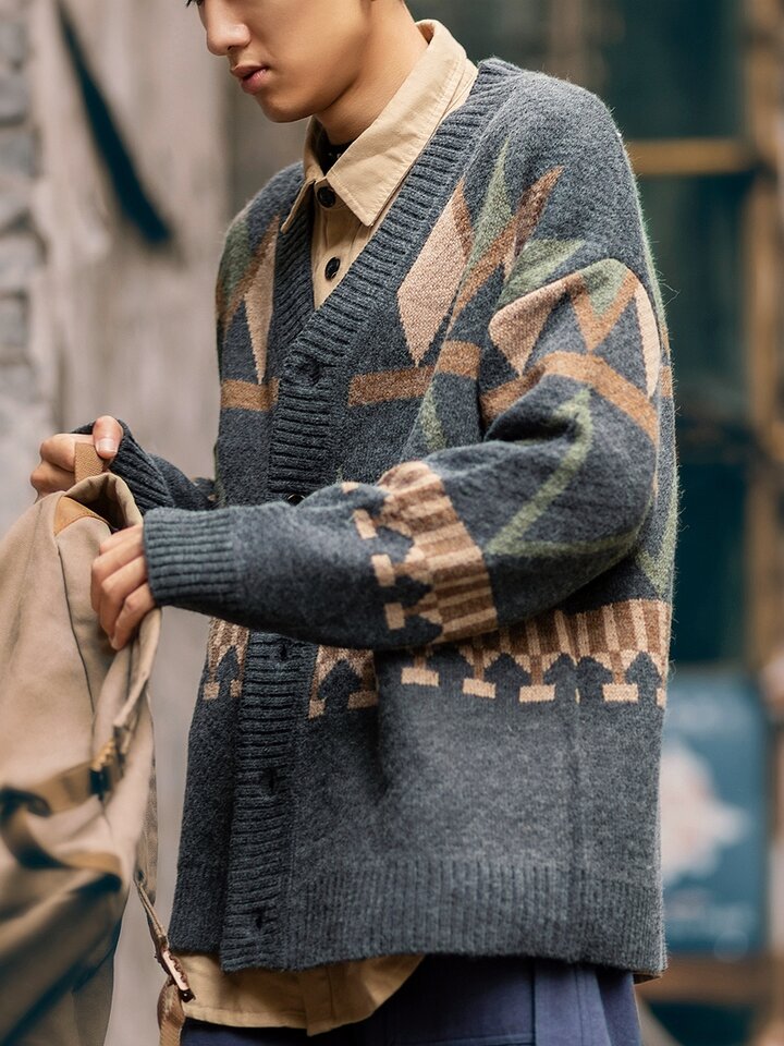 印花使这款毛衣外套不在沉闷,多添趣味落肩袖适合肩部比较平的老铁们穿着,主要起到弱化肩部线条的作用。