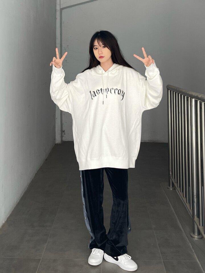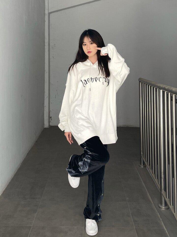 宽松男友风上身随性自然,胸前花体字母和背后爱心很有个性,内里重磅线圈很有质感。