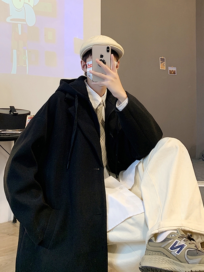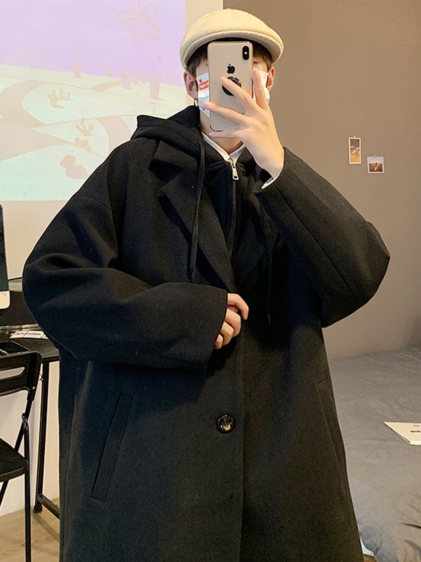 一款休闲时尚的假两件毛呢风衣外套,廓形的衣身设计,很好的修饰了身形,视觉上很显瘦,同时将男性的硬朗气概展现。