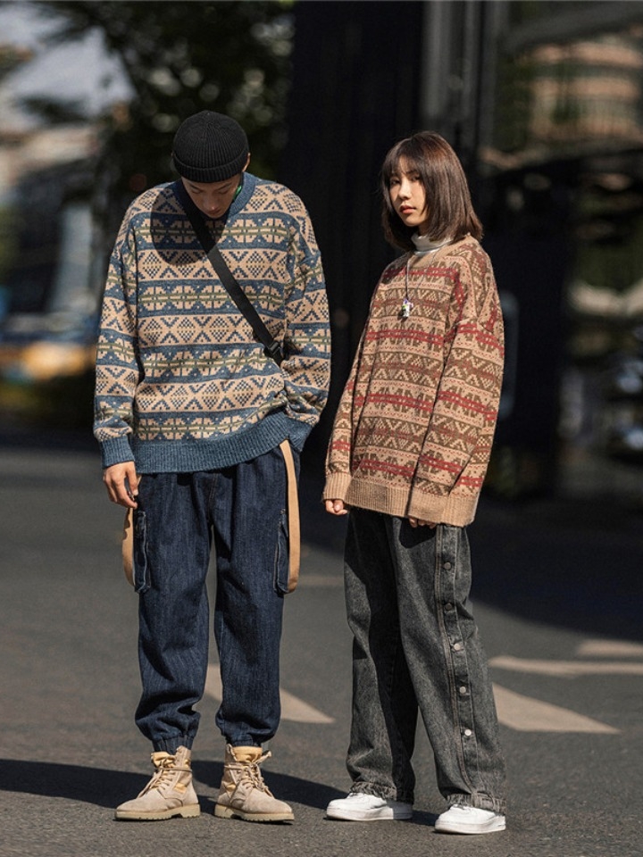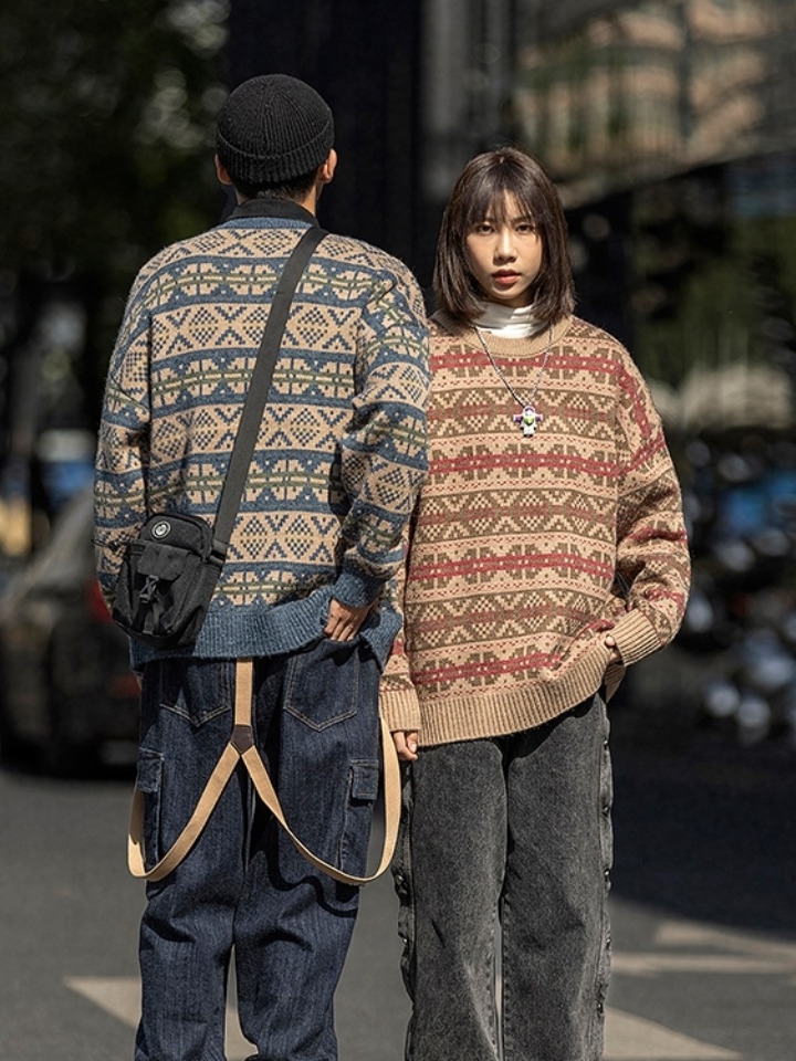 情侣款的针织毛衣,宽松的版型,各种身材都能驾驭 。圆领设计,简约大方;衣身的撞色针织图案,尽显文艺复古风。