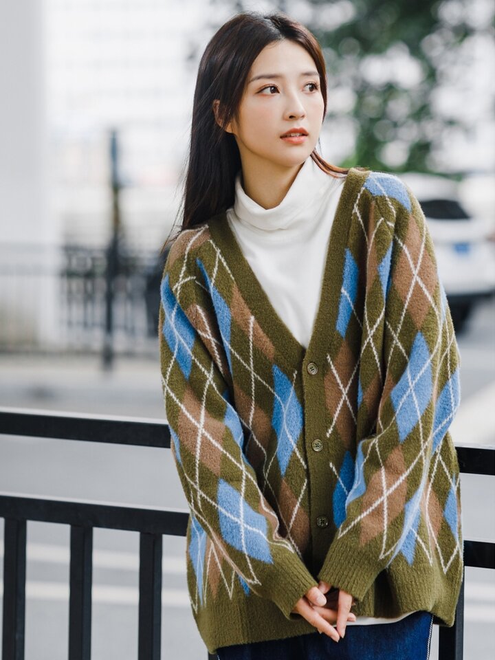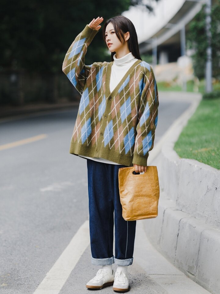 时尚的菱格纹设计,映衬出淡淡的文艺腔调,版型较为宽松,展现精致的衣身轮廓,搭配V型的衣领映衬,干练气质。