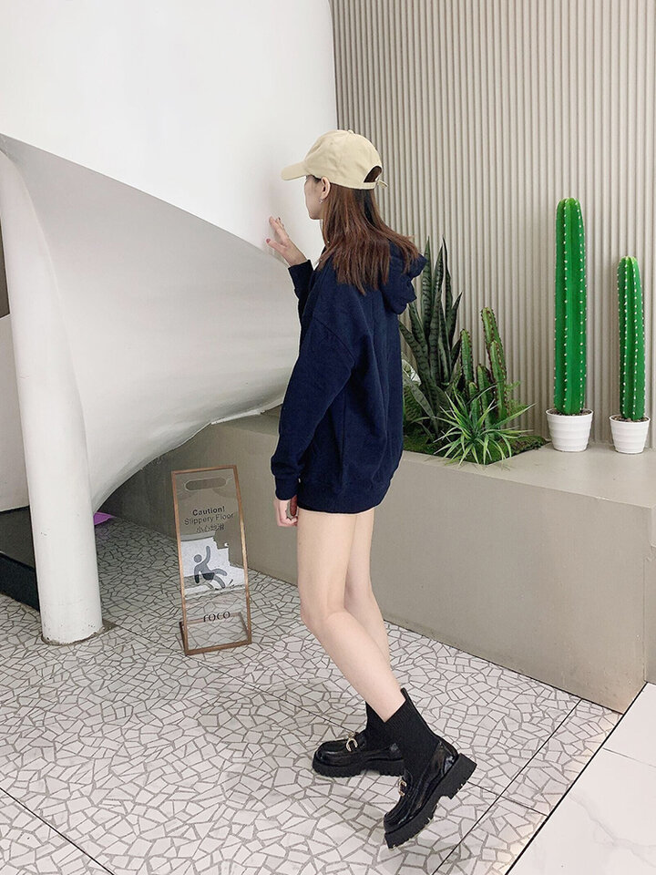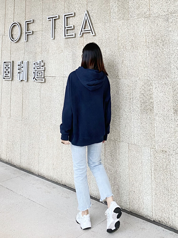中长款连帽卫衣一直是时下流行的款式,上身提升了个人时髦感的同时多了份率性气质,无论是单穿还是内搭,都很百搭。若是搭配上一条休闲短裤,露出你的大长腿,再搭配上一双运动潮鞋,整体打造了街头潮流范,不妨可以尝试这么搭配看看哟。