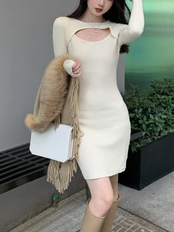 包臀修身针织连衣裙,勾勒曼妙迷人的曲线身姿,线条流畅优美,性感诱人,面料有弹力,舒适不紧绷,领口心机的镂空设计,搭配皮带扣装饰,个性抢眼