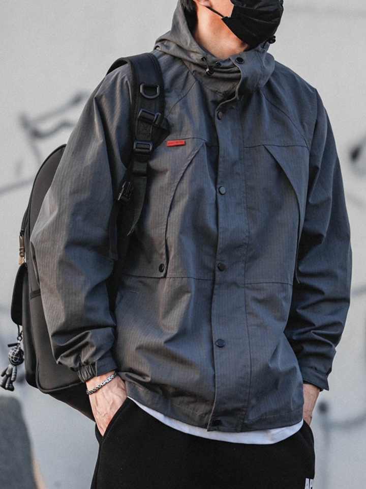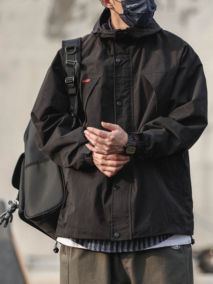 这种冲锋衣看起来不厚,其实是比较抗风的面料,所以秋天穿也很合适。将工装夹克的款式加入连帽设计后更显休闲意味。