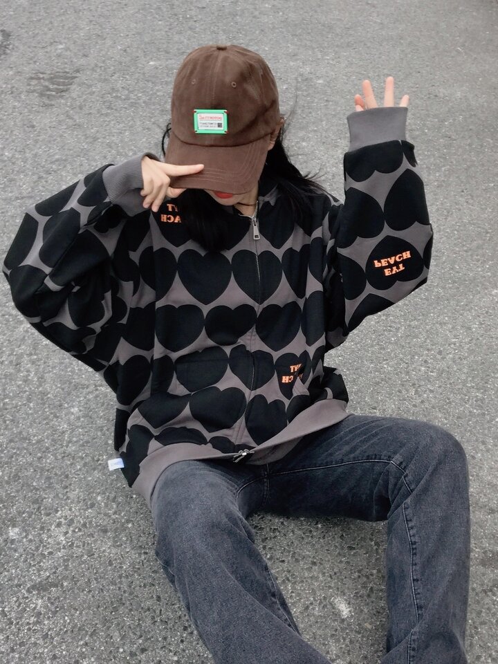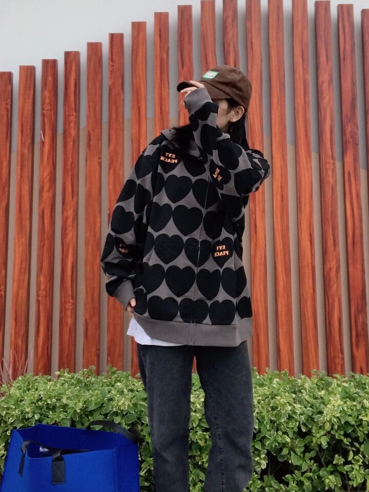 可爱减龄的一款卫衣外套,抽绳连帽,舒适又休闲,落肩长袖,衣袖上桃心图案,别具吸睛,精湛的做工,骨线外露,有种做旧感,拉链门襟,开合顺滑,穿脱方便,大大的口袋,美观又方便实用。