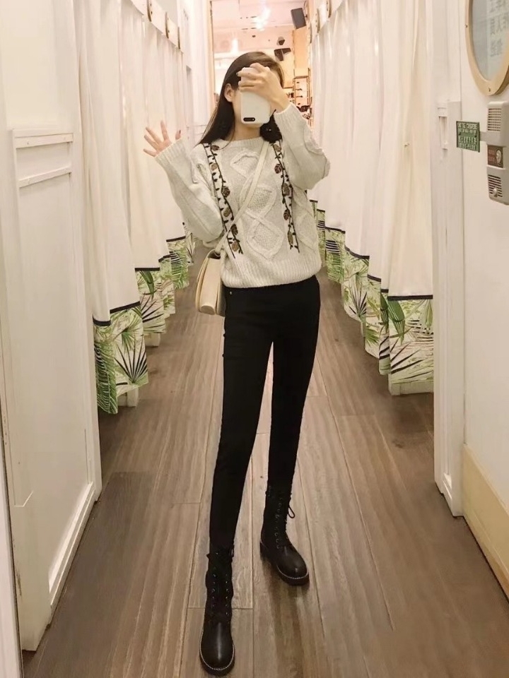 黑色的小脚裤非常的百搭,可以与任何单品自由的组合搭配,上身可以搭配宽松的卫衣,上宽下瘦的造型,脚上可搭配白色的板鞋,运动感十足。