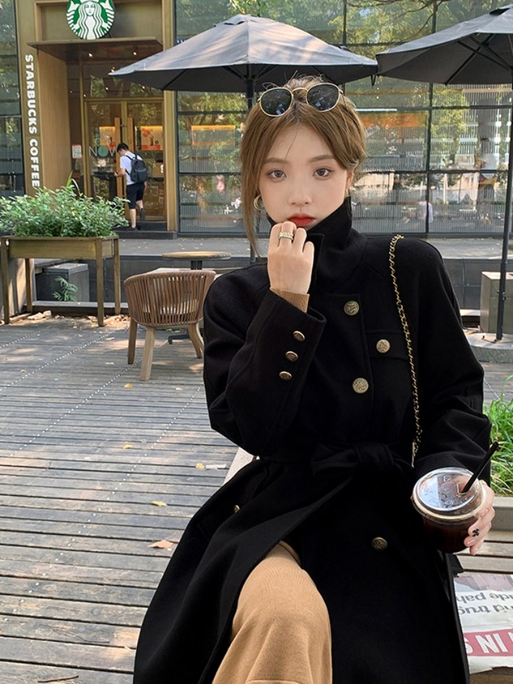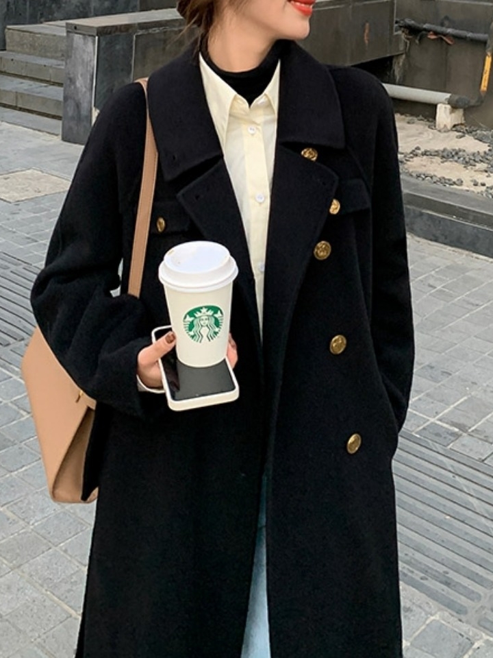 时尚雅致的立体剪裁设计,提升整体层次,打造富有空间感的造型,具有很好的修身显瘦效果,两侧翻盖口袋装饰,收插双手尽显文艺休闲格调,衣装选用黑色双面呢子面料制作而成,质地厚实柔软,穿着倍感温暖舒适,展现出女性高贵典雅的气质。