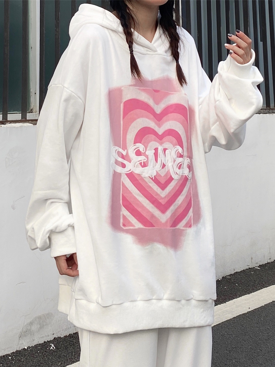 休闲的情侣卫衣,采用经典的连帽设计,具有很好的减龄效果,展现青春活力。胸前的爱心涂鸦,带来丰富的视觉效果,丰富了衣身的造型,街头范儿十足。袖口以及下摆的螺纹收口设计,提升了穿着的舒适度,防风保暖。宽松的落肩袖版型,减少了对身材的束缚,带来轻松自在的穿着。
