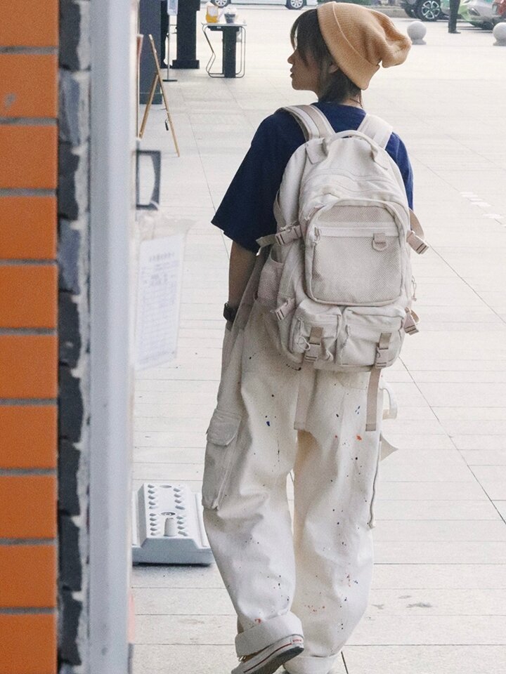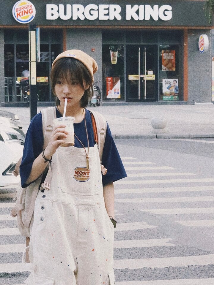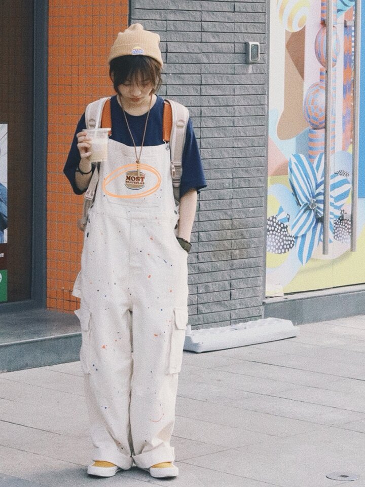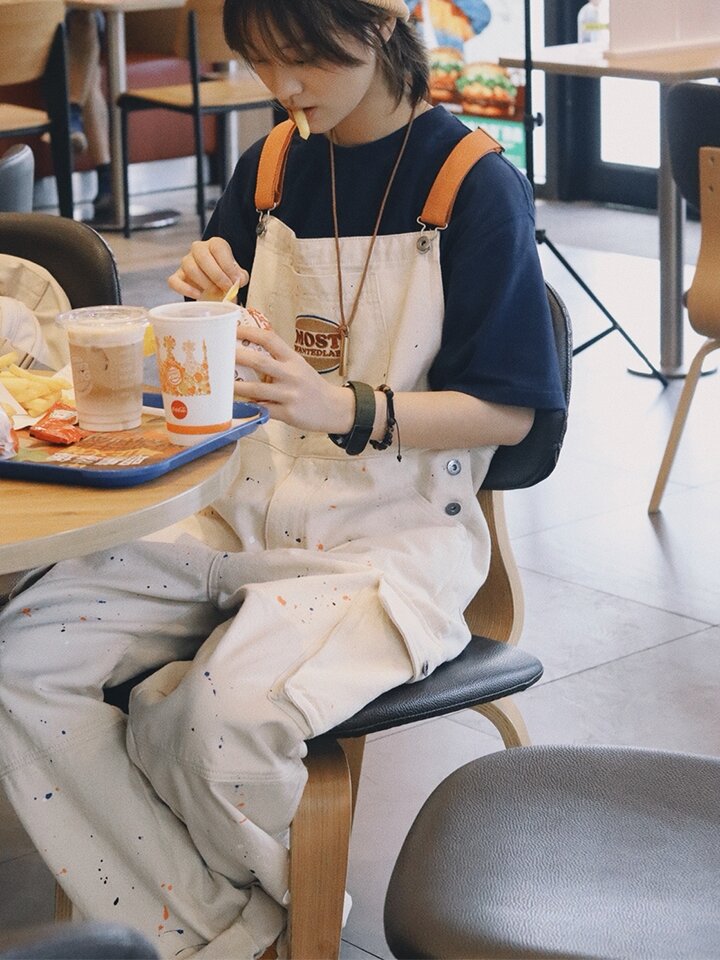 背带长裤经过水洗工艺,使缝线处带有古味肌理效果,结合手工泼墨工艺创造出浓厚多层的面料肌理感。胸口口袋结合季度主题“饮食男女”设计汉堡刺绣图案,与汉堡T恤、汉堡教练夹克。