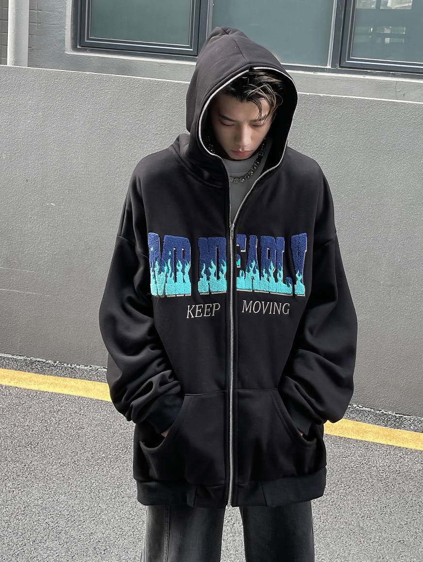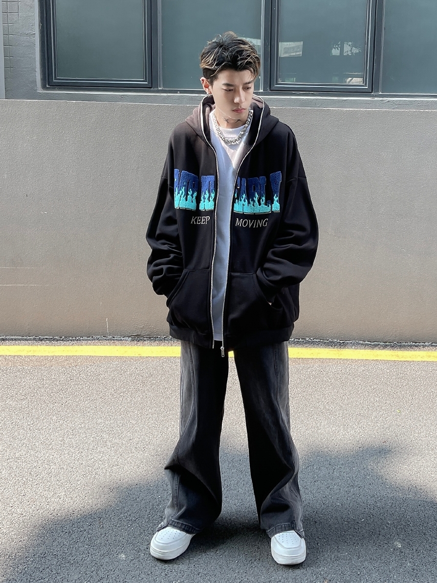 正面胸口与背面大面积的搞怪图案相应,色彩拼接独特时尚,突出街头酷帅的流行风格,连帽边缘与袖子两边的白色字母装饰,明显的黑白设计潮流百搭。