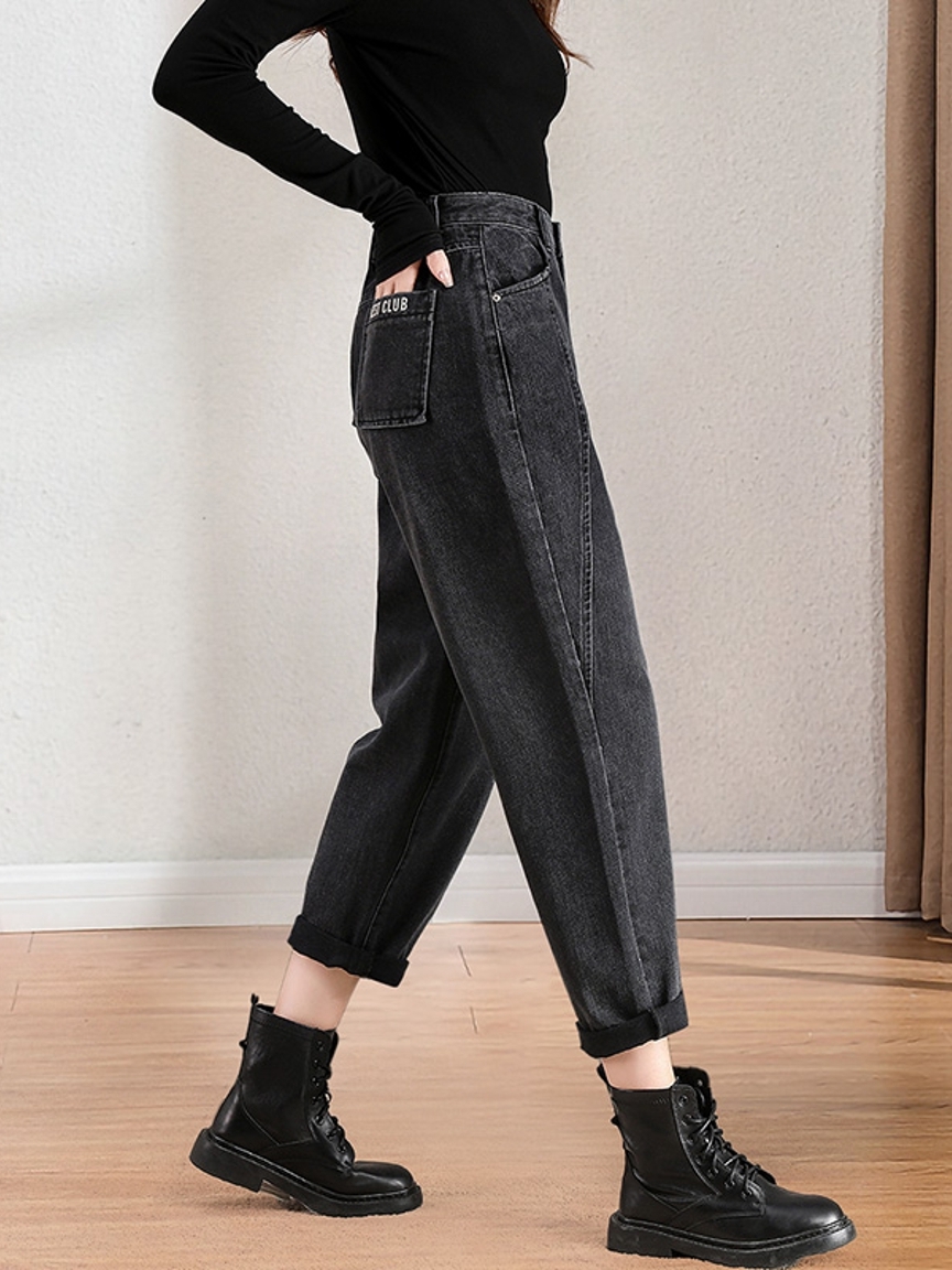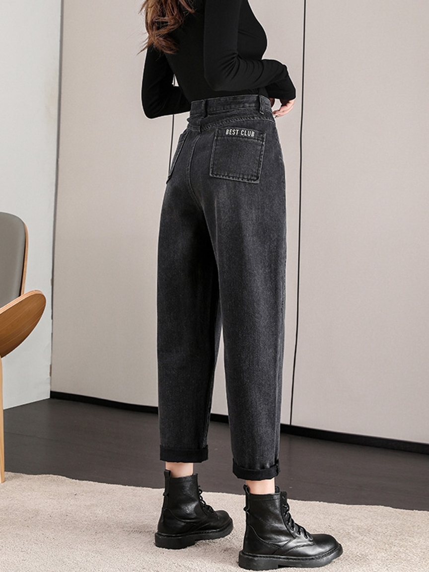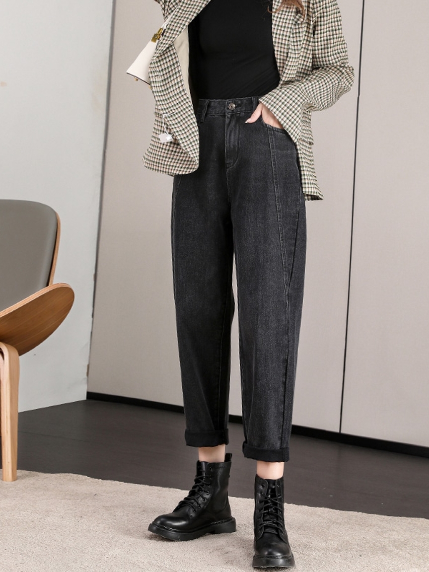 高腰设计,拉长身材比例。高腰牛仔裤,显瘦显腿长。直筒裤型,修饰腿部线条。