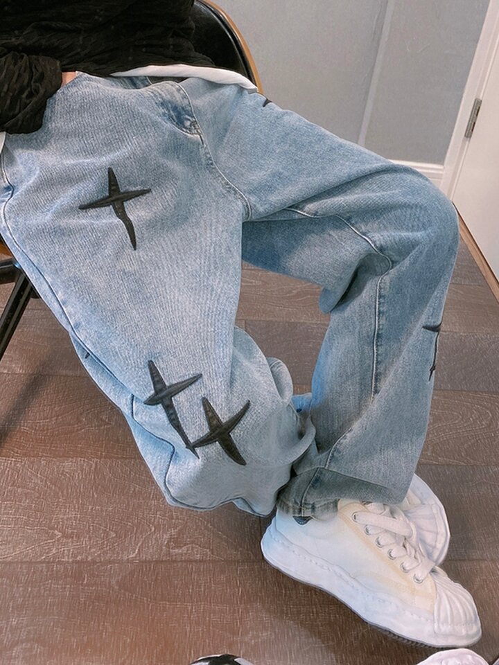 一款休闲时尚的十字贴布绣牛仔裤,比较宽松的裤腿设计,很好的修饰了腿部线条,视觉上很是显瘦时尚。
