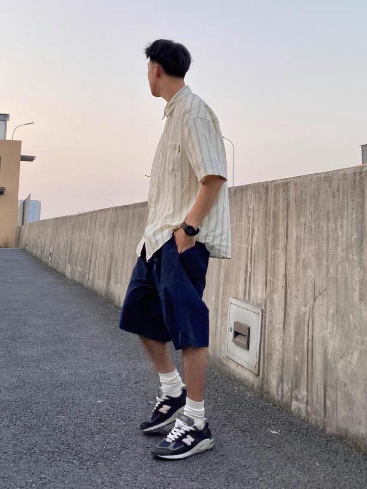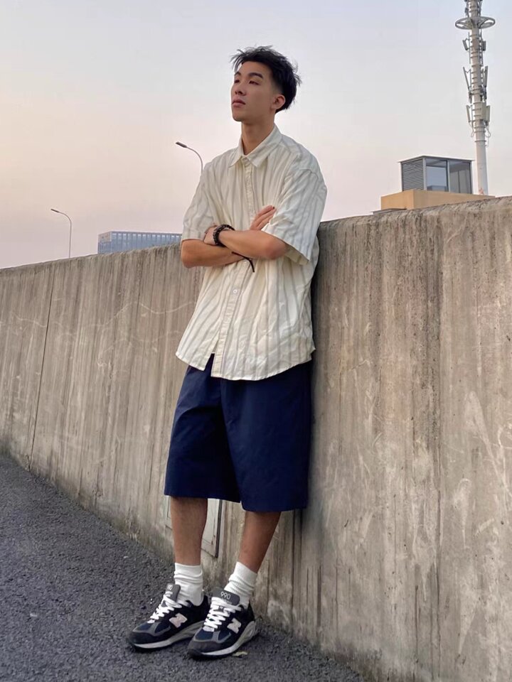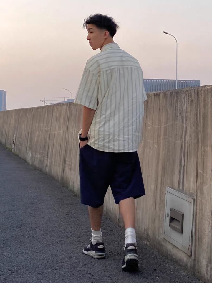 这样具有一定的港风气息的衬衫,我认为配一款藏青色或者是黑色的短裤再好不过了,尤其是穿着这件衣服,在傍晚吹着海风,衣摆飘动的复古艺术气息不禁显露。