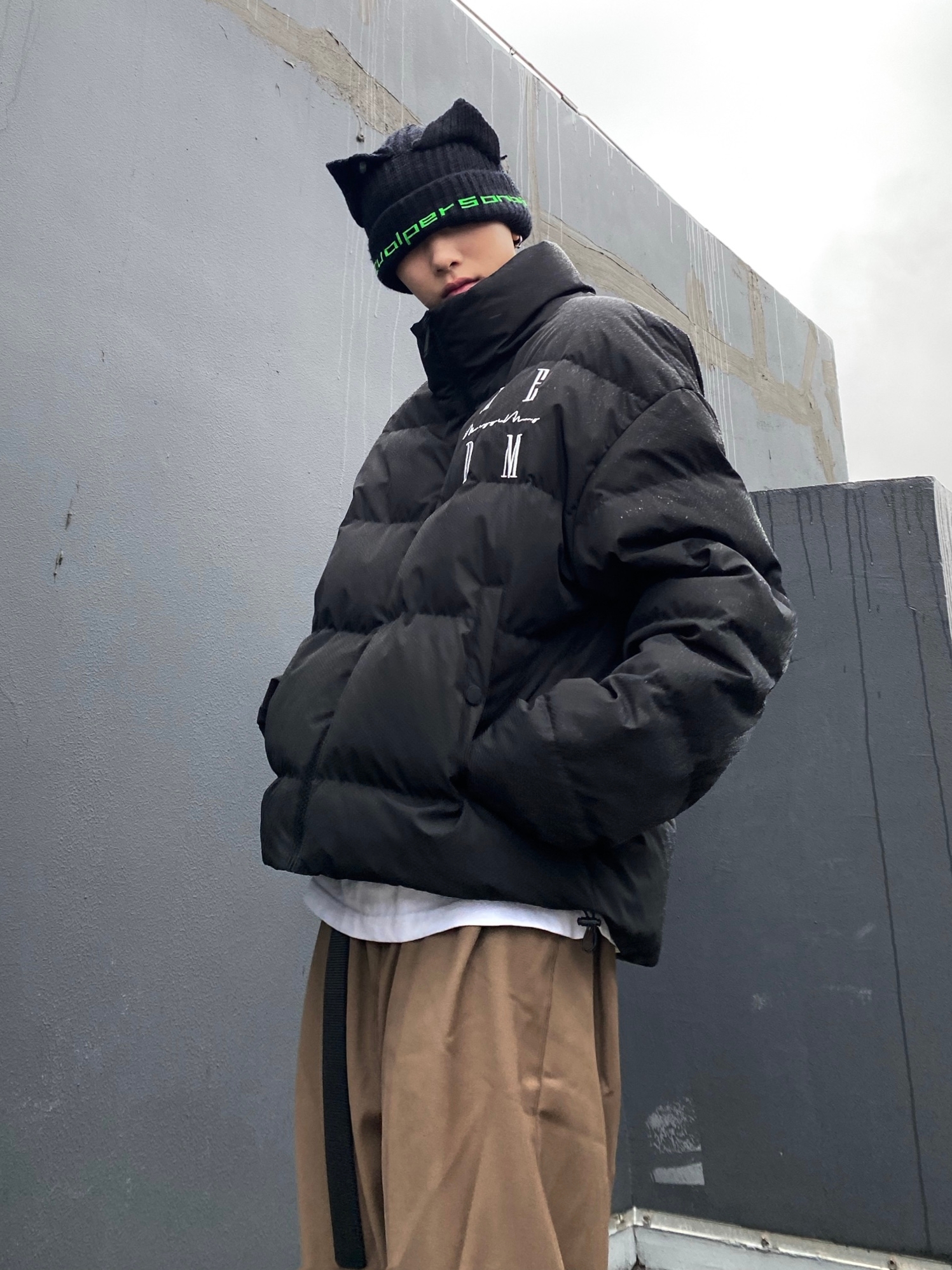 羽绒服作为秋冬必入的单品,还在纠结穿什么颜色吗?要显瘦的话当然是黑色的,加上撞色的字母印花,简洁干练的立领口,肩膀处精致缝线,更好的秀出男士健美的线条。