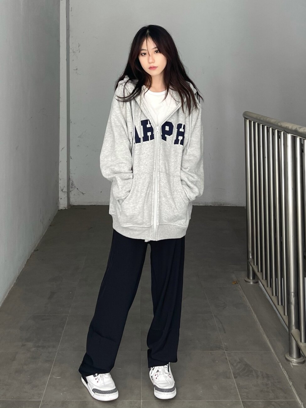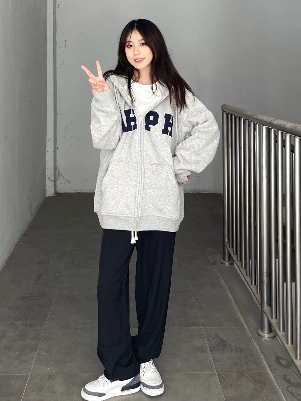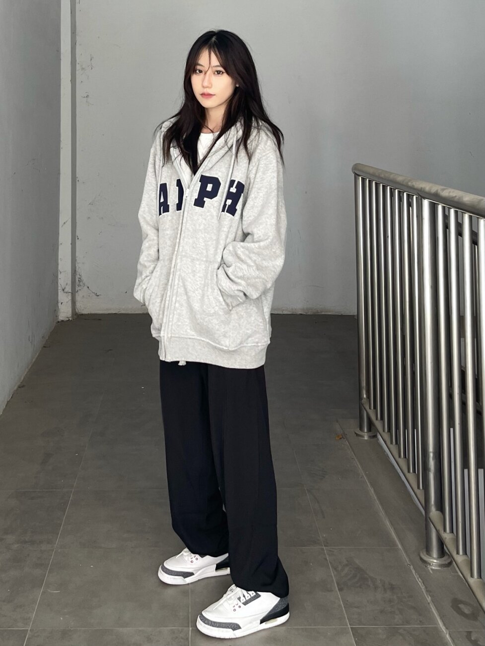 灰麻色天生就自带一种慵懒温暖的感觉,卫衣开衫和灰色简直是绝配了,胸前字母贴布增加了视觉亮点,不会过于单调。