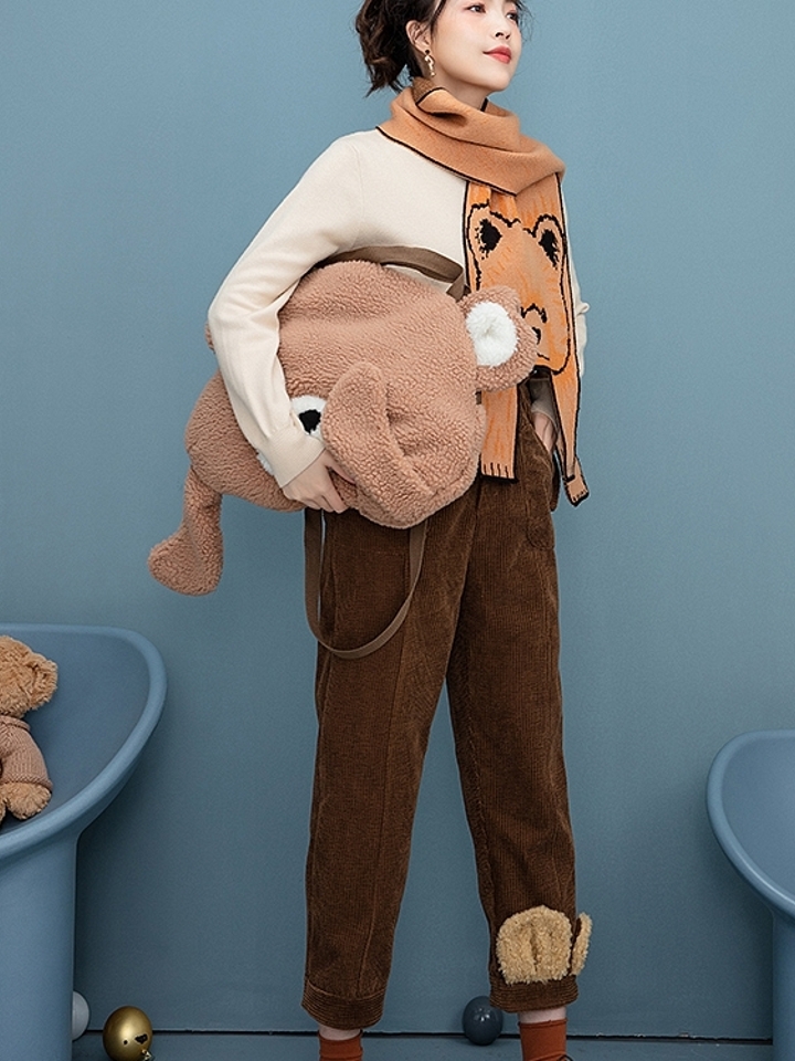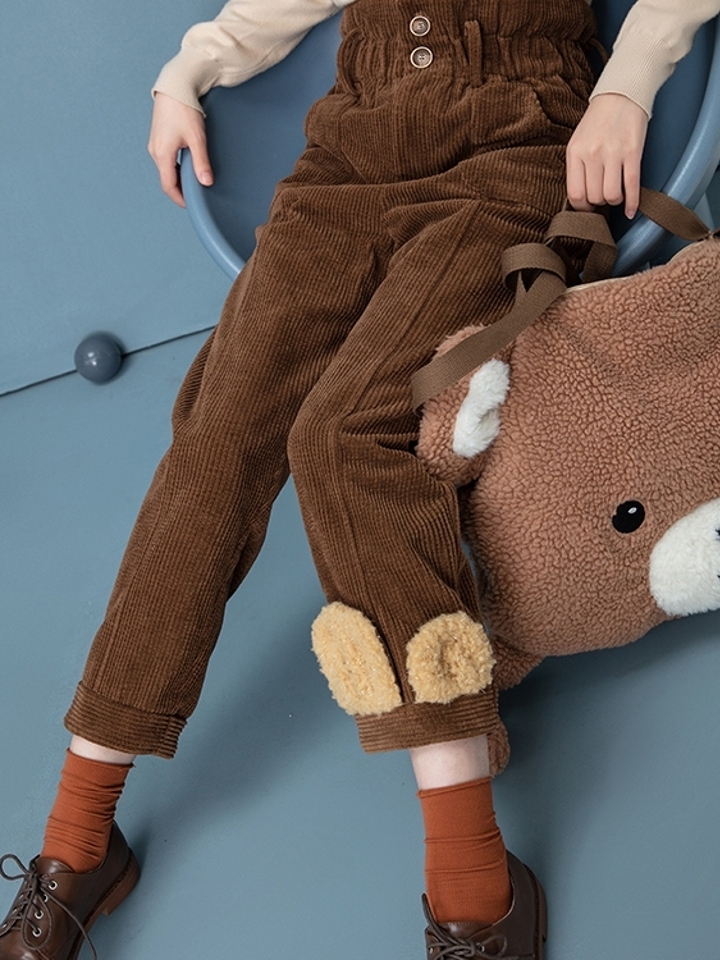 温暖的灯芯绒材质,复古气质棕色调,舒适松紧腰,纹理饱满,贴合不勒腹,裤脚折叠线,微微卷起,时髦感爆棚。
