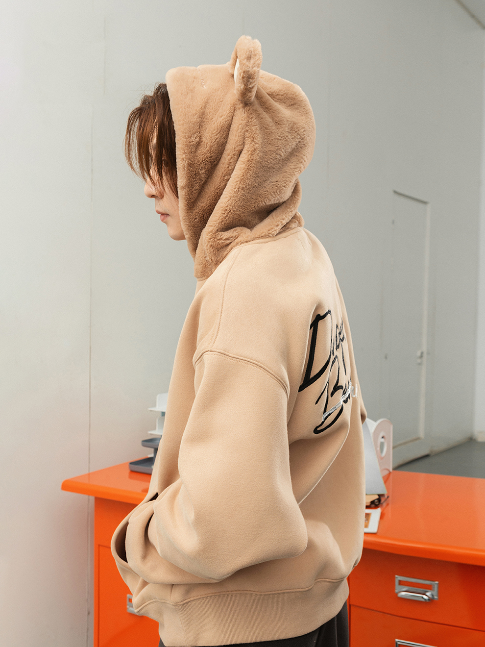基础款式的卫衣其实非常厚实,抓绒的内里非常亲肤,宽松的版型在胸口上印有两个小熊图案,非常可爱俏皮,帽子上的耳朵,非常有趣,为衣服增加一丝童趣。采用连帽设计,抓绒卫衣,宽松的设计舒适自然,又具保暖性。
