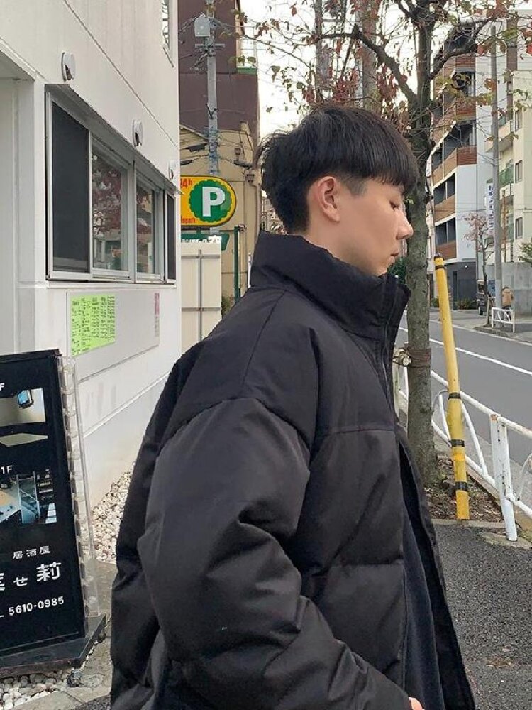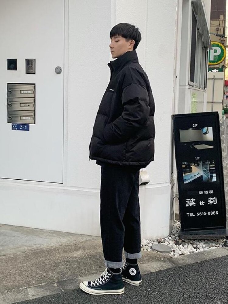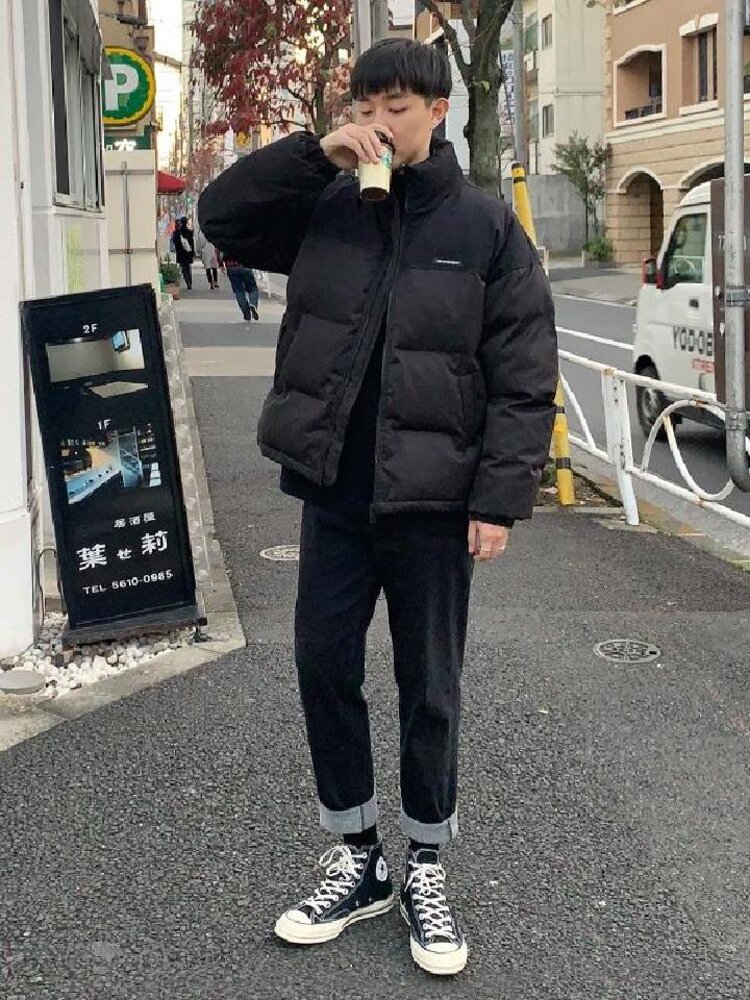 面包服虽然看起来有点臃肿,但不得不说它的保暖性真的非常好,并且穿起来柔软又轻便。内搭黑色高领毛衣,下搭黑色小脚牛仔裤,再穿双复古高帮帆布鞋,打造你的潮流冬季LOOK。