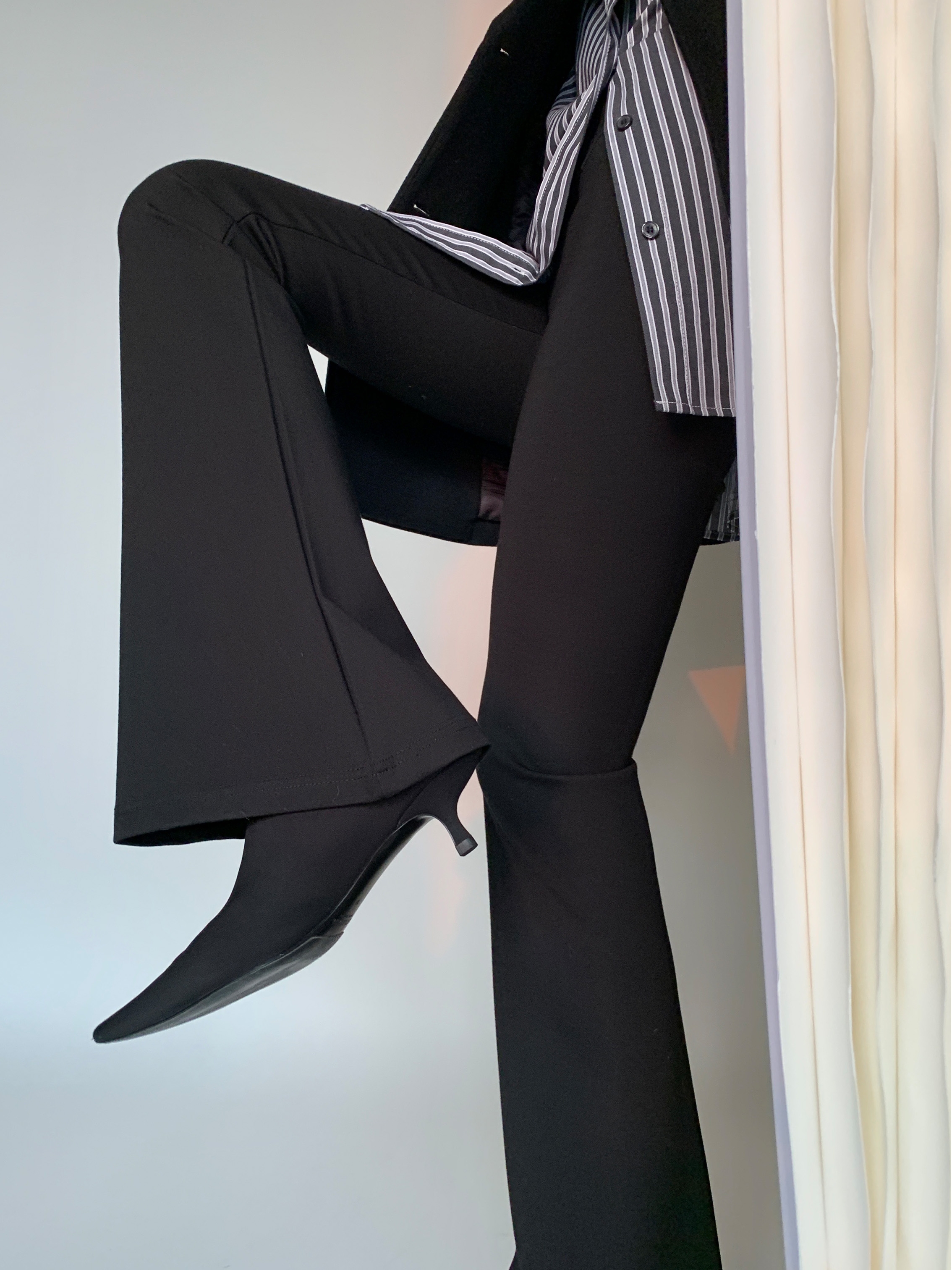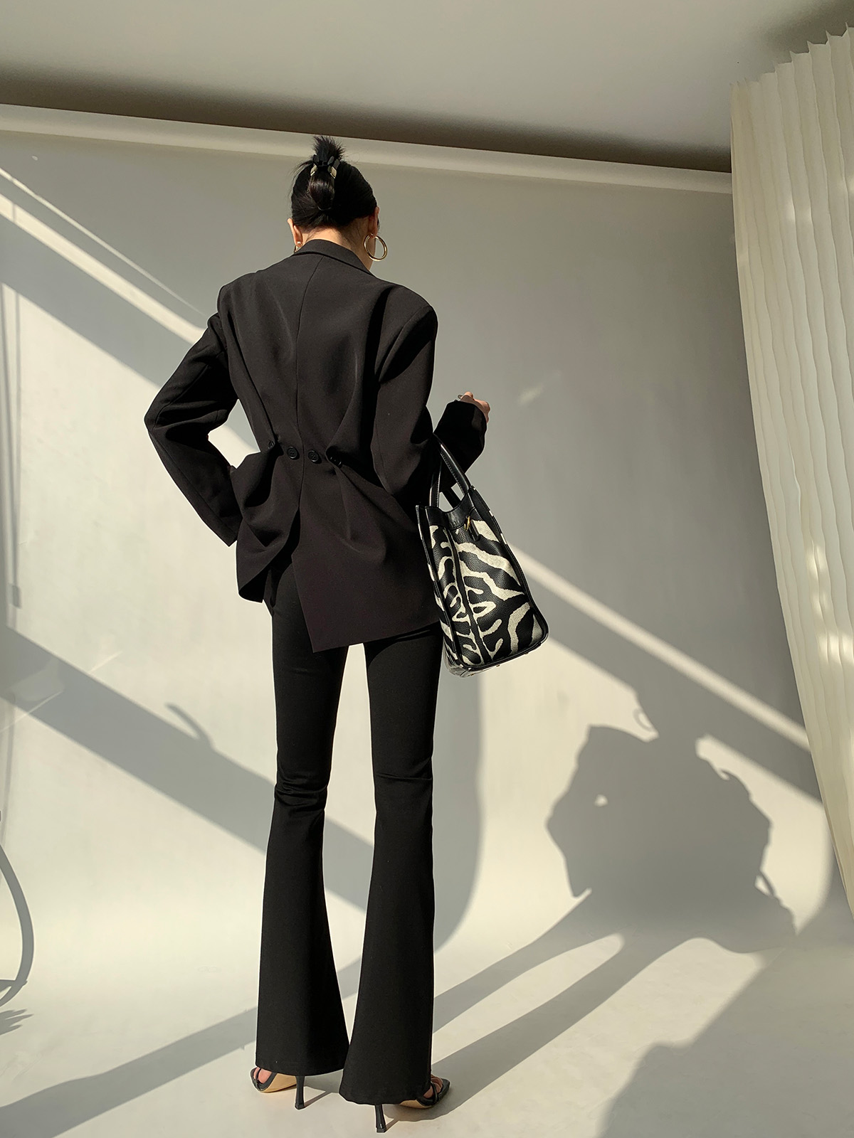 上身显瘦又特别的凸显气质,小高腰的设计拉长腿部线条,小短腿瞬间长了不少呢,版型是比较修身的那种,上身超级超级显瘦的啊,女神范啊,简直了,裤脚就是微喇的那种。