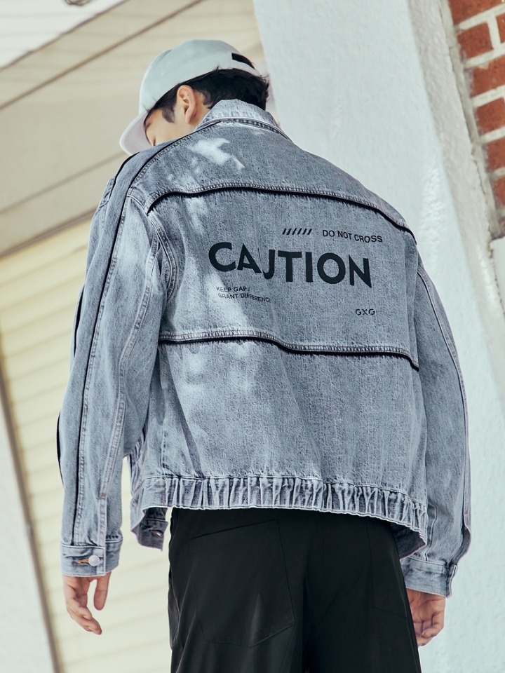 深灰色的一件翻领夹克,面料是经过水洗做旧的牛仔面料,给人的感觉很有质感。衣服上搭配口袋装饰加上撞色的明线很有古着范儿。