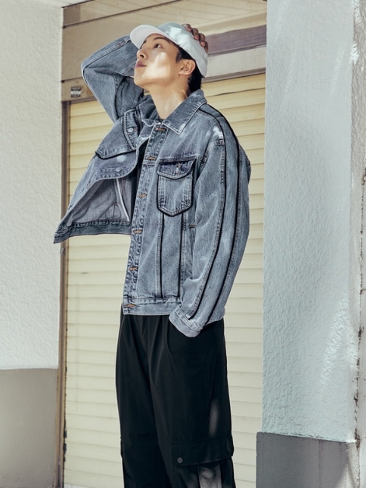 很简约的一件黑色夹克,面料是经过水洗的牛仔,质感十足夹克上没有其他装饰,只有撞色的明线设计,看上去简洁利落。