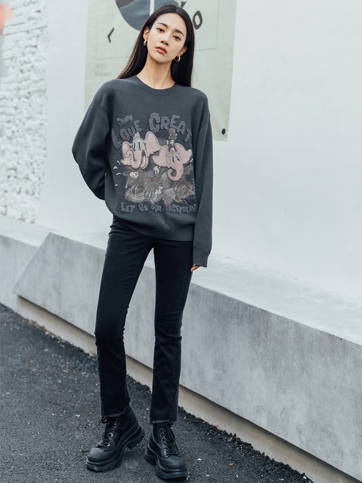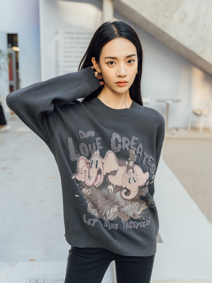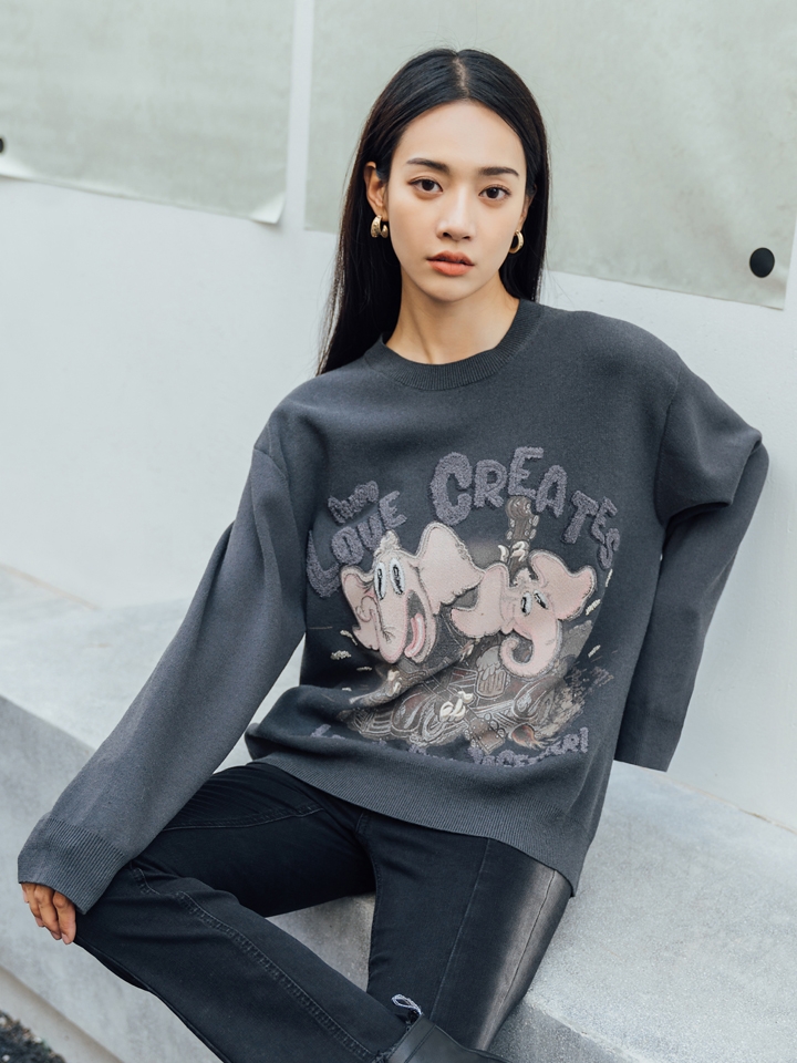 我觉得秋冬有点无趣沉闷,所以我在买秋冬单品时总喜欢选具有趣味性的,像这件毛衣就是才买的。每当我看见毛衣上面的两只大象在一起弹吉他唱歌,自己的心情就有变好一点,跟着它们一起享受着愉快时光。
