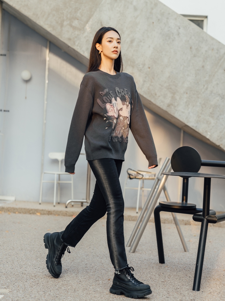 我平时喜欢酷飒穿搭风格,所以与这款毛衣搭配我选择了一条黑色牛仔裤,打造出上宽 下紧的穿法,配上一双厚底鞋更具有摩登范儿,又能够带来增高的效果。若是想要更具有个性一点,可以加入链条项链与腋下包,彰显率性。
