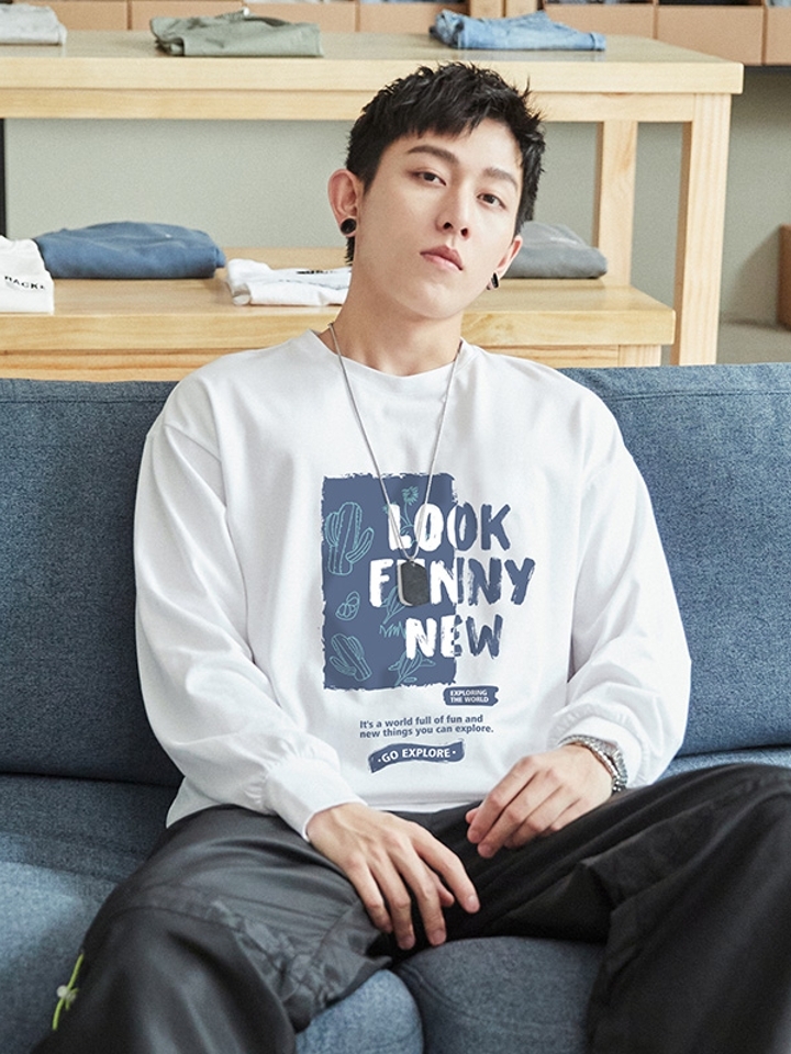 很简约的款式哦,经典的圆领可以很好地修饰脖颈哦,搭配上一款修身的牛仔裤或是运动裤都可以穿出大长腿的男神风范哦,在春季外搭一款时尚的牛仔服或是中长款的风衣都能穿出减龄的学院风哦。