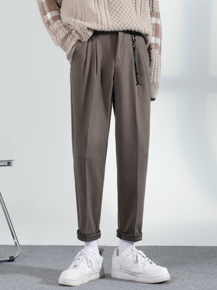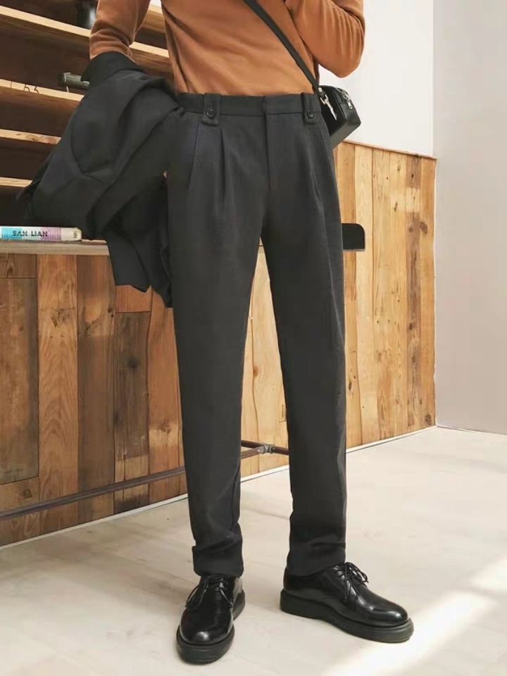 带有休闲气息的小直筒西裤,小直筒的修身版型可以搭配正式风的鞋子,也可以搭配休闲风格的鞋子,都能帅气十足。