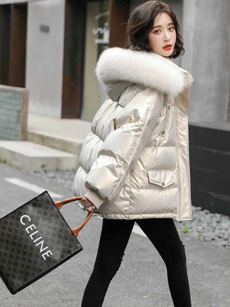 这款时尚的羽绒服,宽松的版型,对于身材有着很好的包容性,显瘦又不臃肿,大大的毛量围绕在帽檐边,瞬间提升了整体的时髦感。