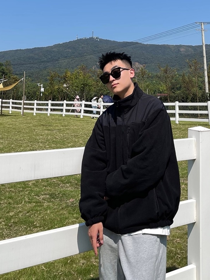 这款可以两穿的夹克外套,摇粒绒的拼接设计,保暖性好。可以与加绒的运动裤和老爹鞋相配,戴上墨镜,就是街头最靓的仔。