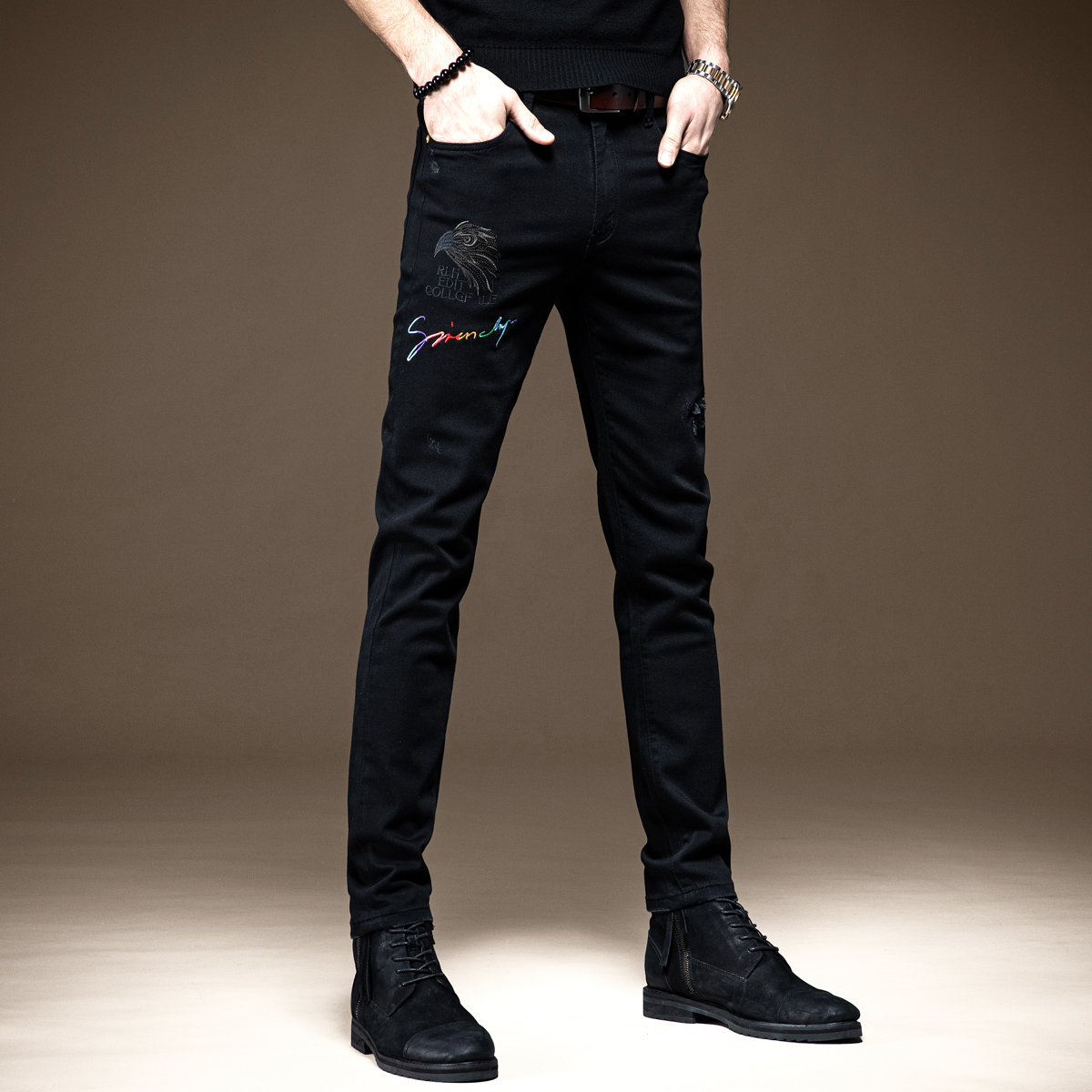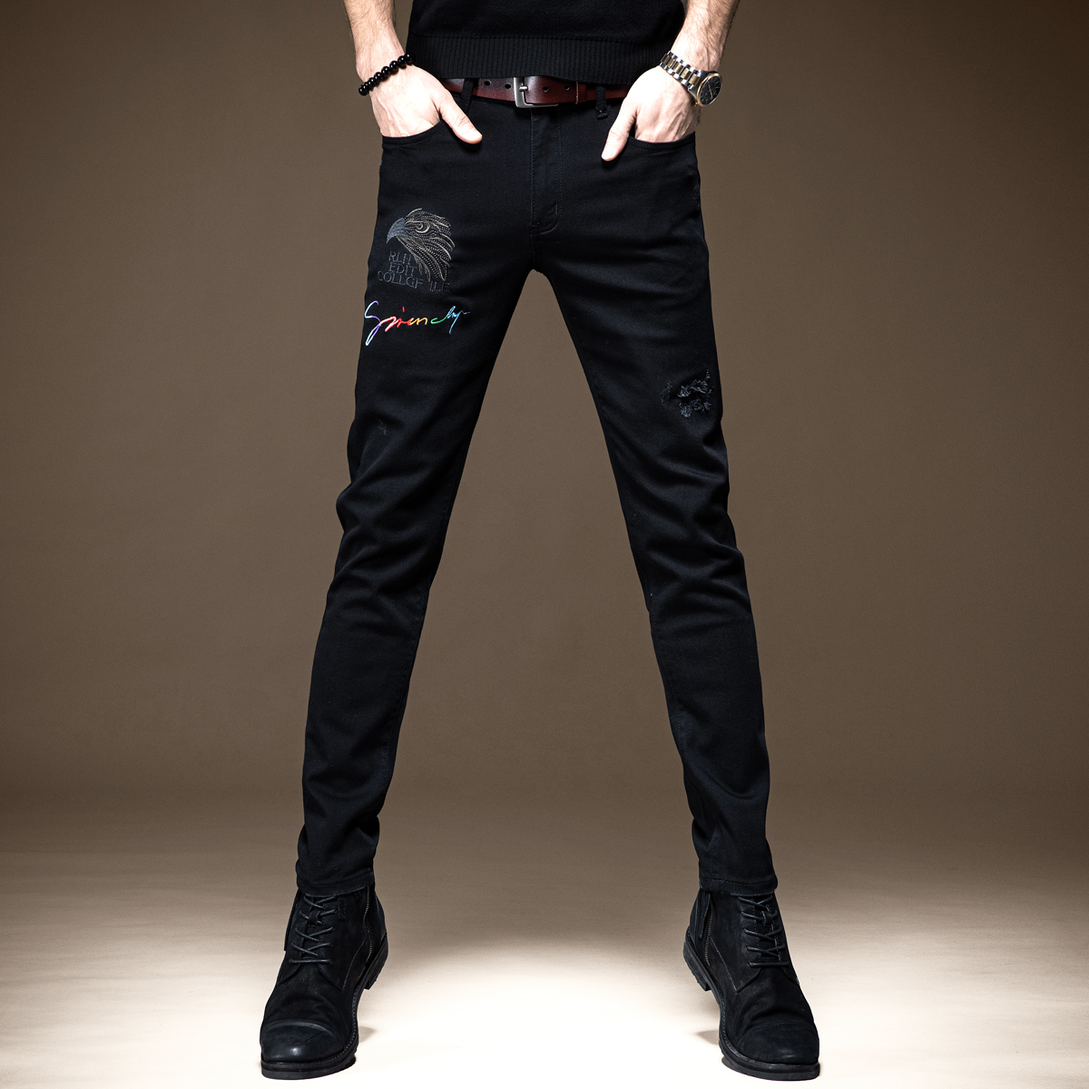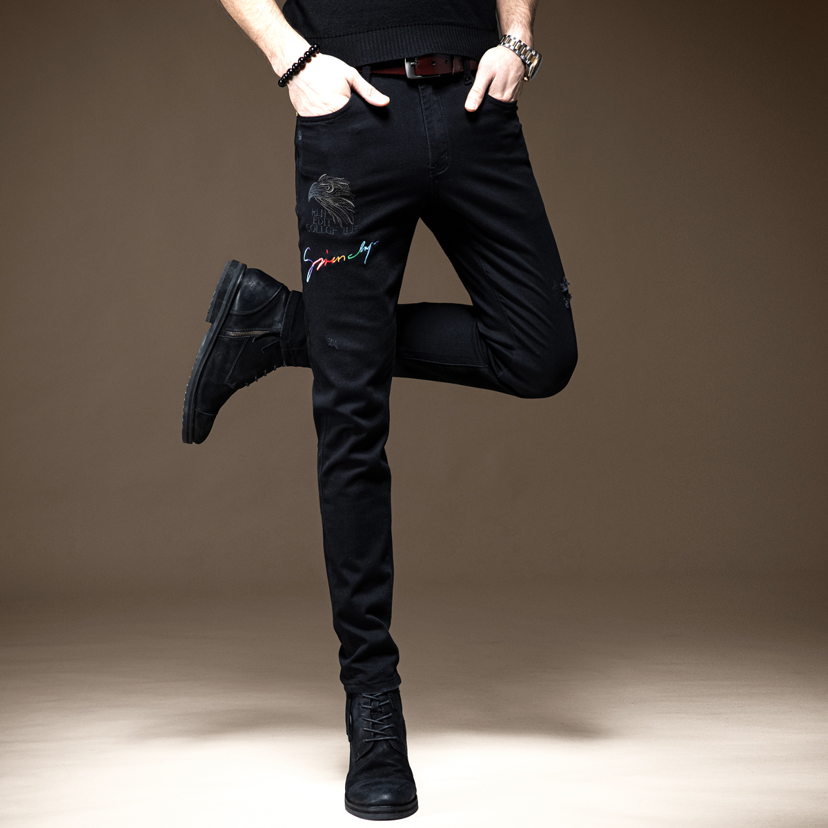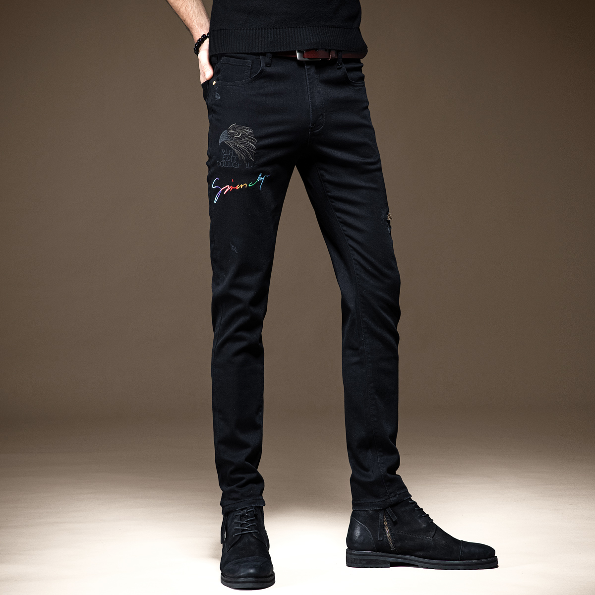 简约百搭的一款牛仔裤,小脚的版型,能够很好的修饰腿部的线条,打造出大长腿的即视感。