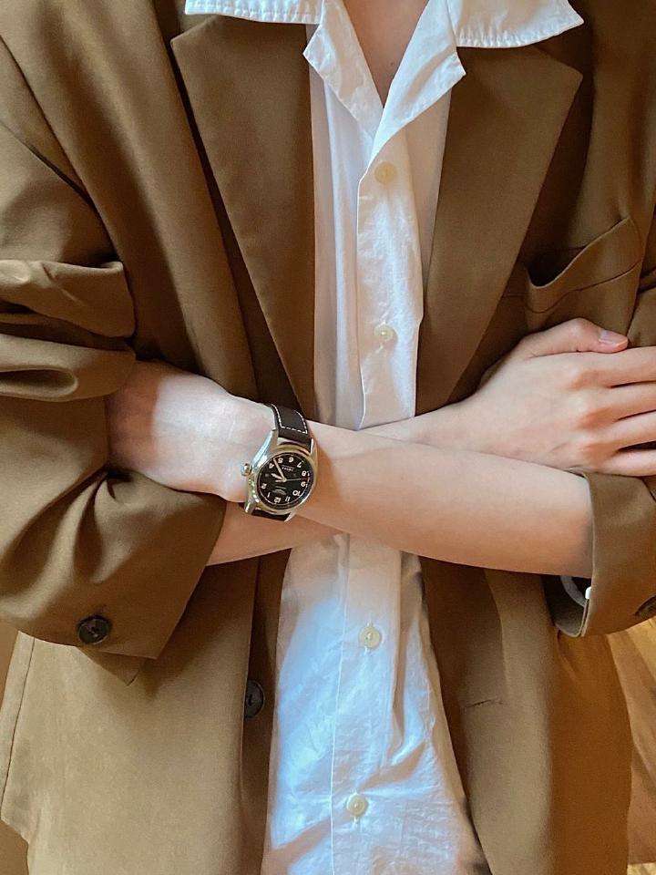 黑色哑光表盘搭配镀银沙色指针非常的高级,弧面表镜与1940年代典型的阶梯式表壳设计非常经典且不会过时。而且它非常的百搭。
