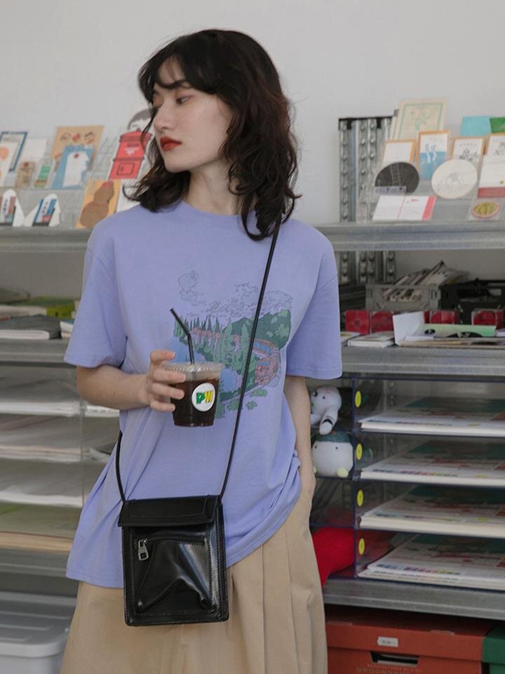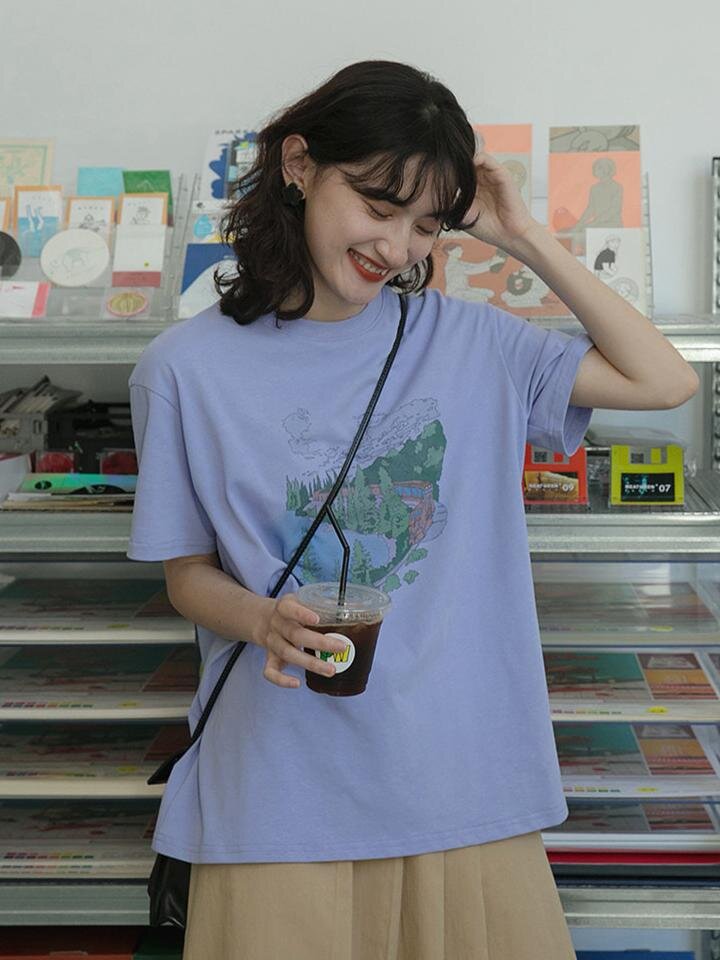 香芋紫色调的宽松风景印花t恤,搭配卡其色半身裙与英伦风黑色小皮鞋,穿出甜美休闲的时尚感。