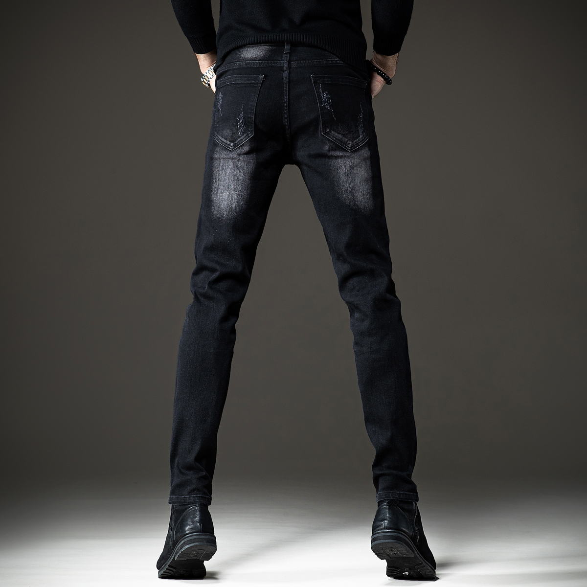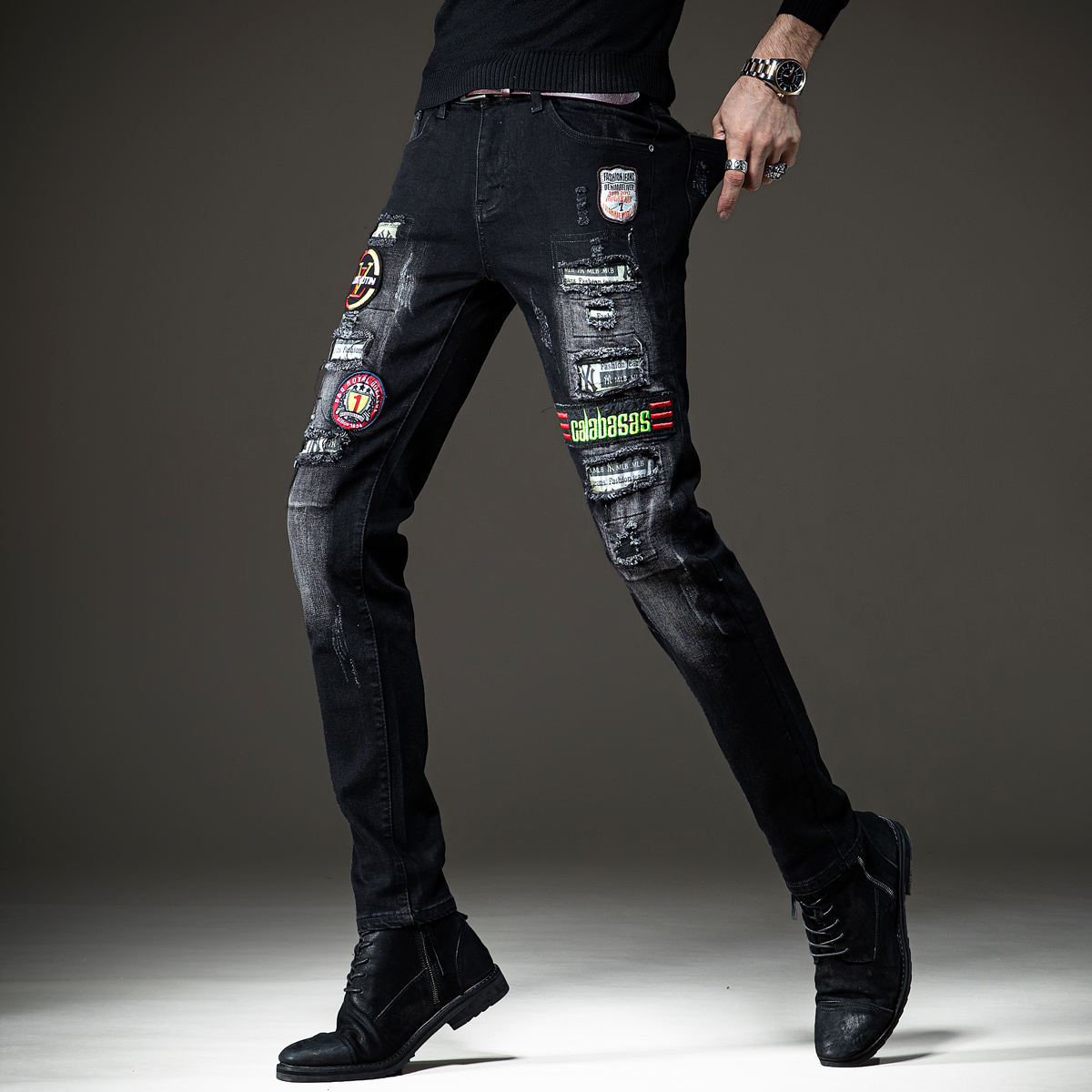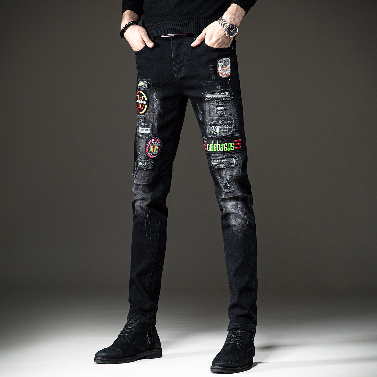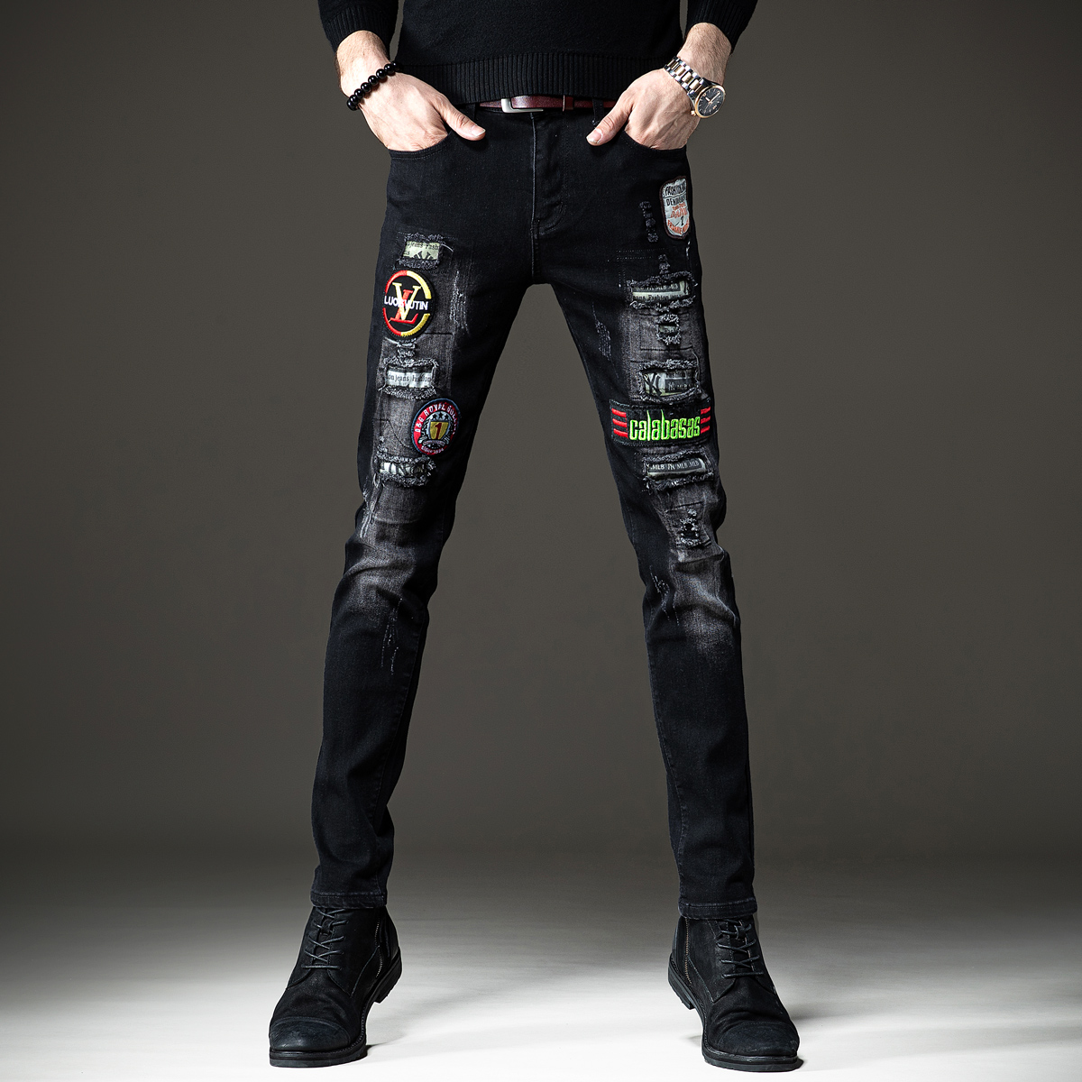 这款牛仔裤采用了优质的牛仔面料,穿着舒适透气,修身的版型设计,上身效果很好,破洞的设计很有个性,搭配一件T恤,就能轻松穿出潮男范。