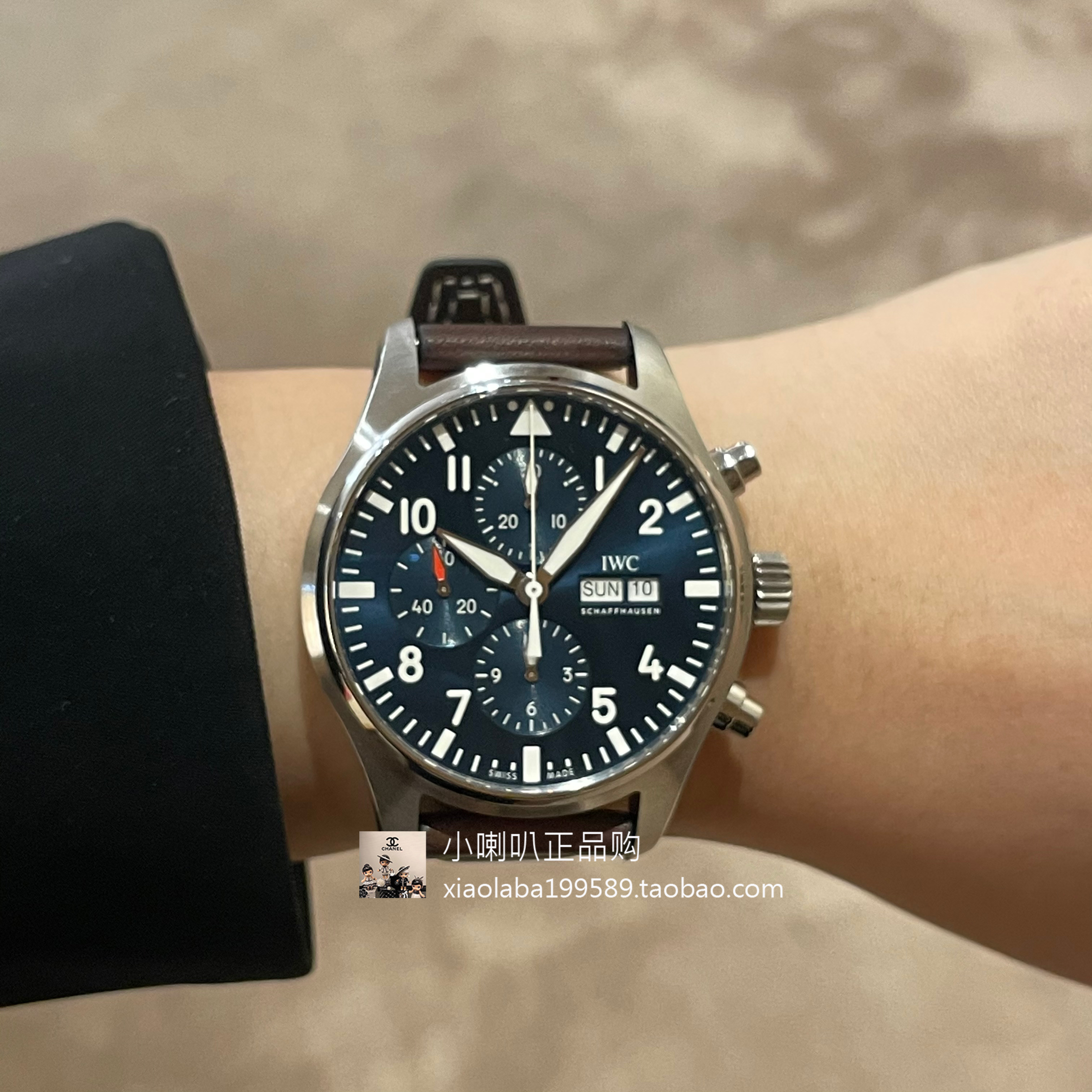 IWC飞行员计时手表,经典的圆形表盘设计,搭配上黑色的表盘,彰显男士的硬朗气质。